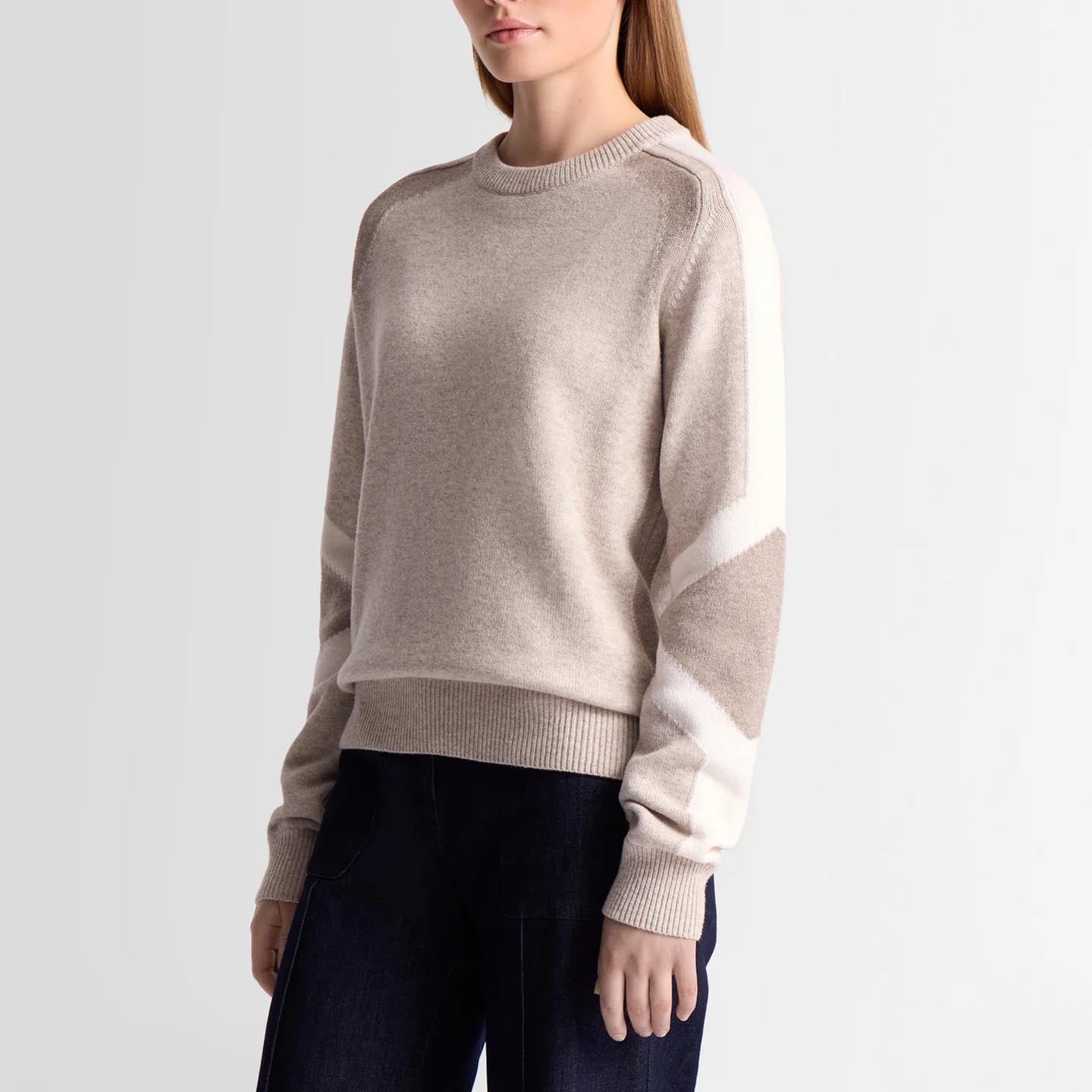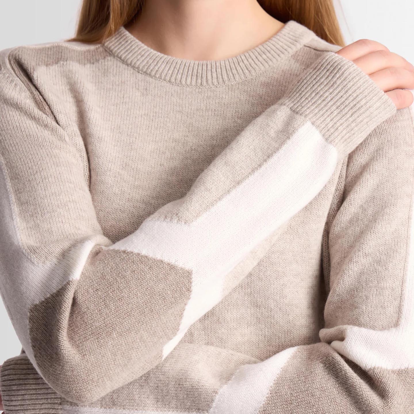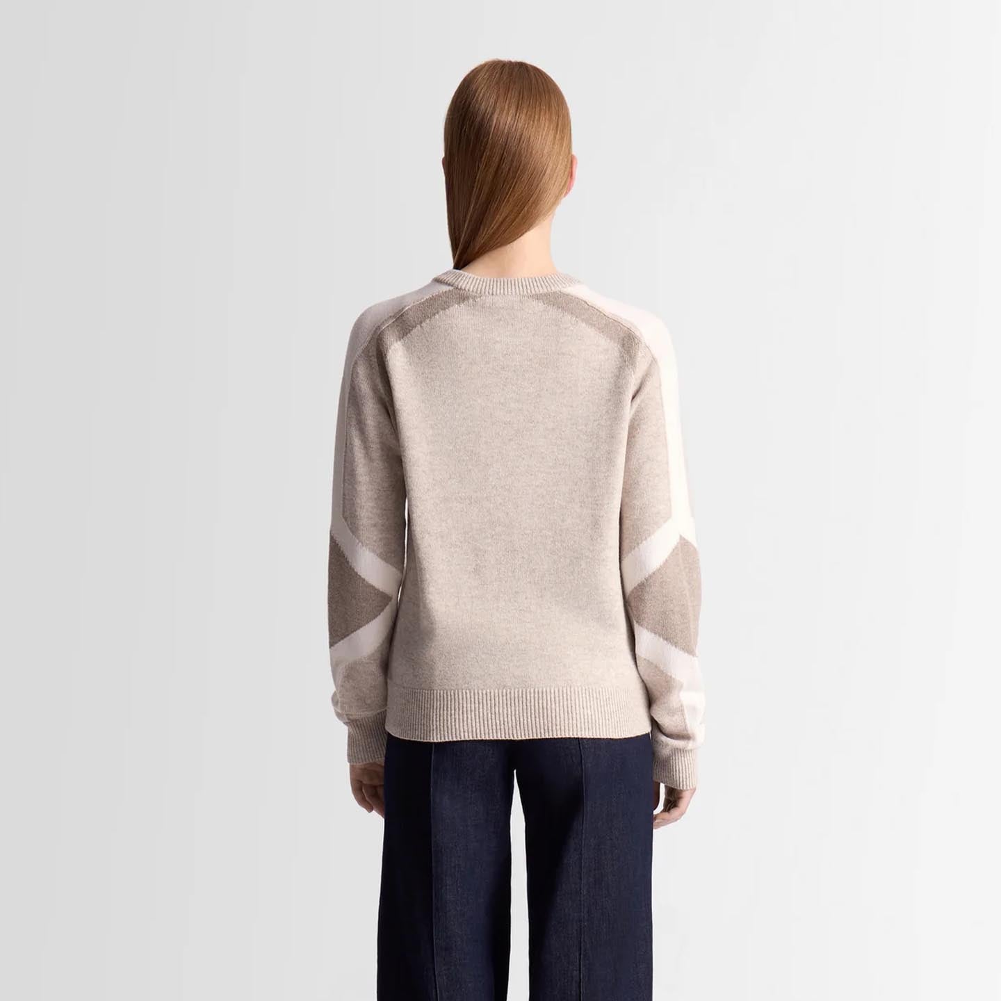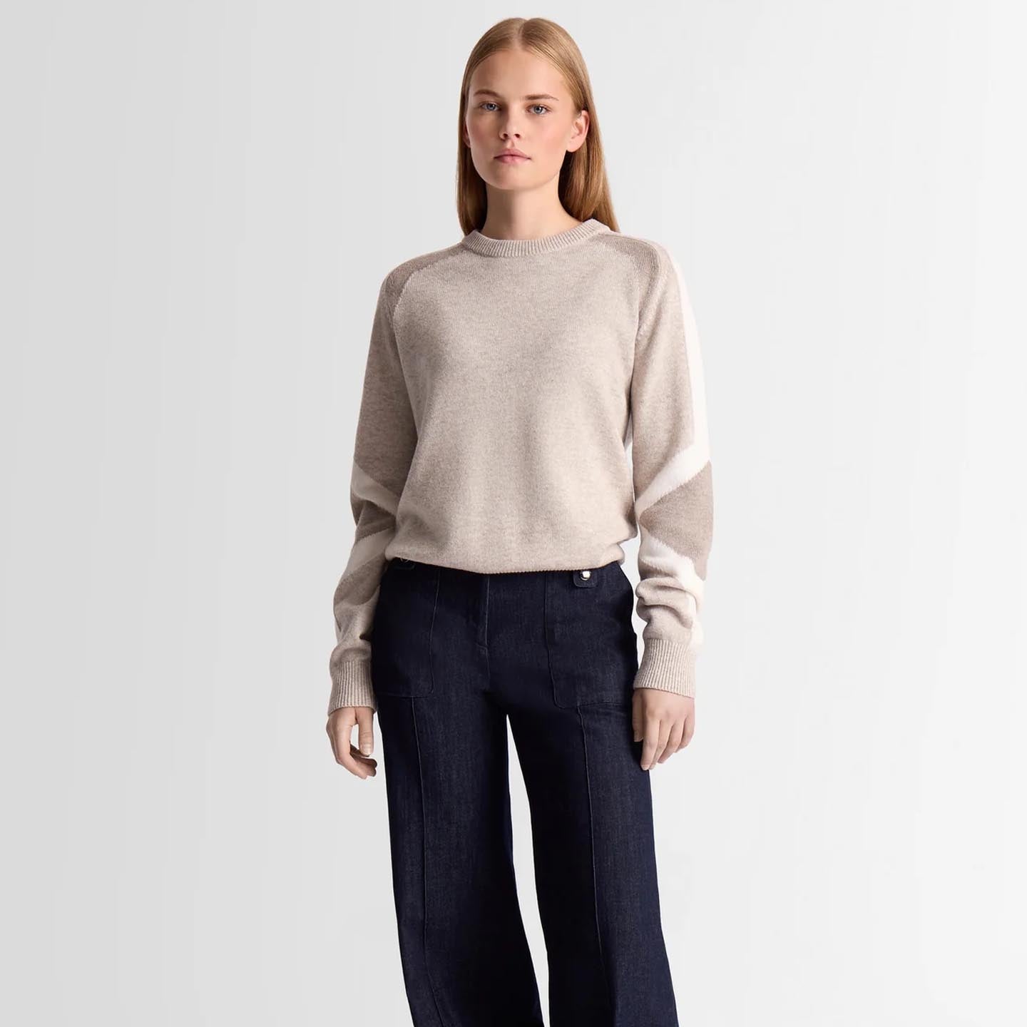 The Rivena sweater, in wool and cashmere, combines softness and lightness for comfortable wear all year round. Its medium-weight jersey knit offers a versatile essential, enhanced by a colorblock pattern on the sleeve and elbow. Inspired by the iconic Clarisse ski suit, this crew-neck, long-sleeved design adds a graphic, contemporary touch to the women’s wardrobe.