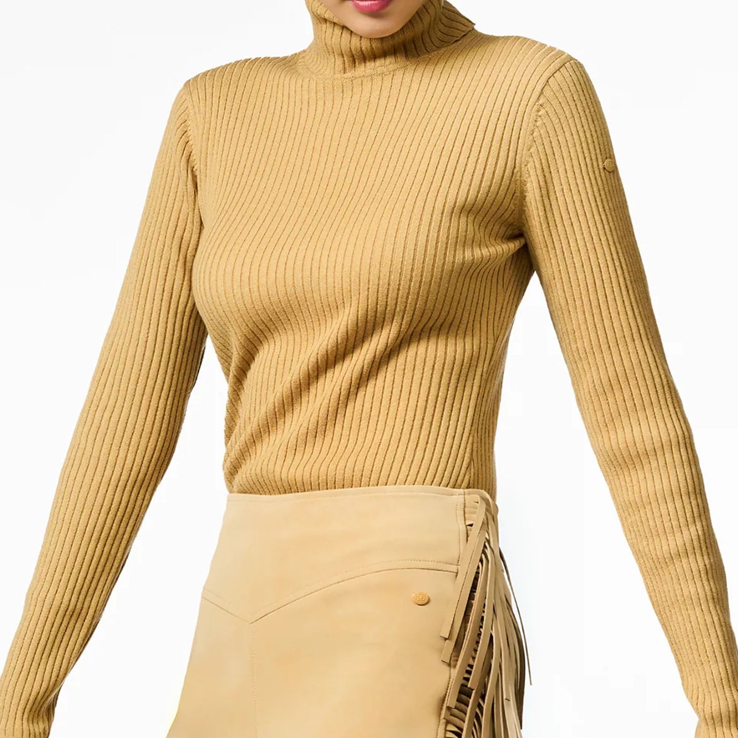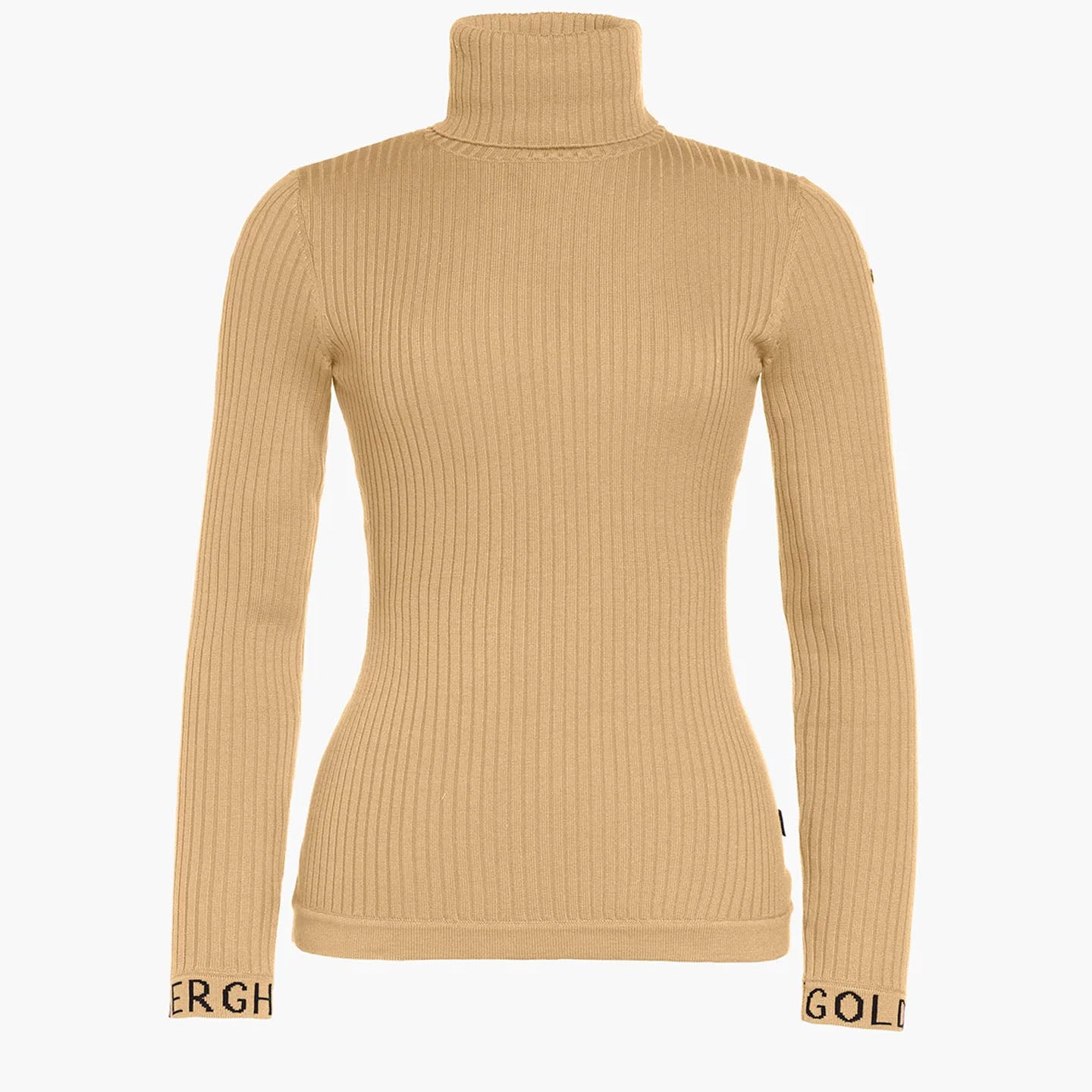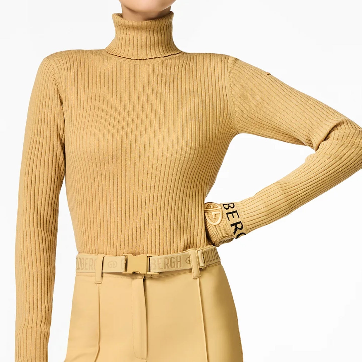 A refined essential for cold-weather layering, this fine rib knit sweater is crafted from a soft 4×3 rib blend of merino wool, acrylic, and polyamide. Designed with a close-fitting foldover collar, it sits smoothly under jackets while offering elevated everyday comfort. Contrast Goldbergh branding at the cuffs adds a subtle sport-lux touch, complemented by metal branding at the sleeve and a woven label at the side.