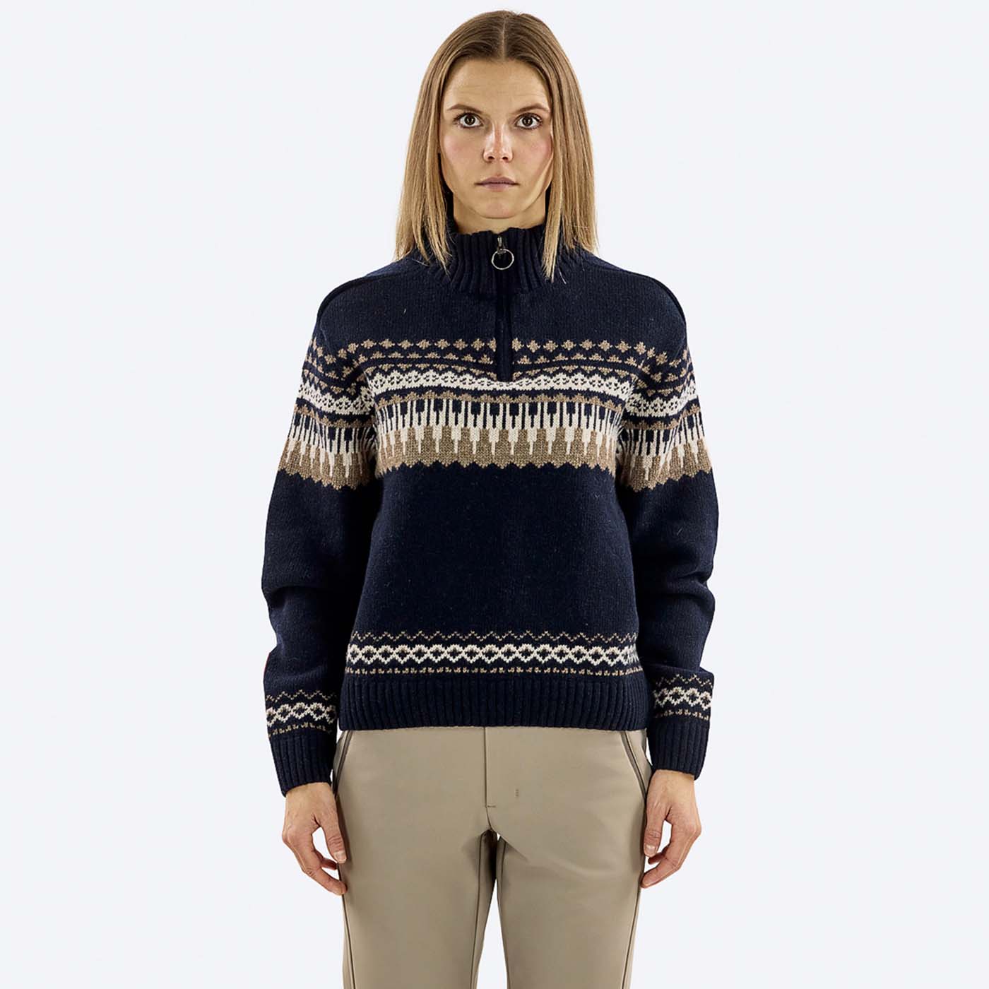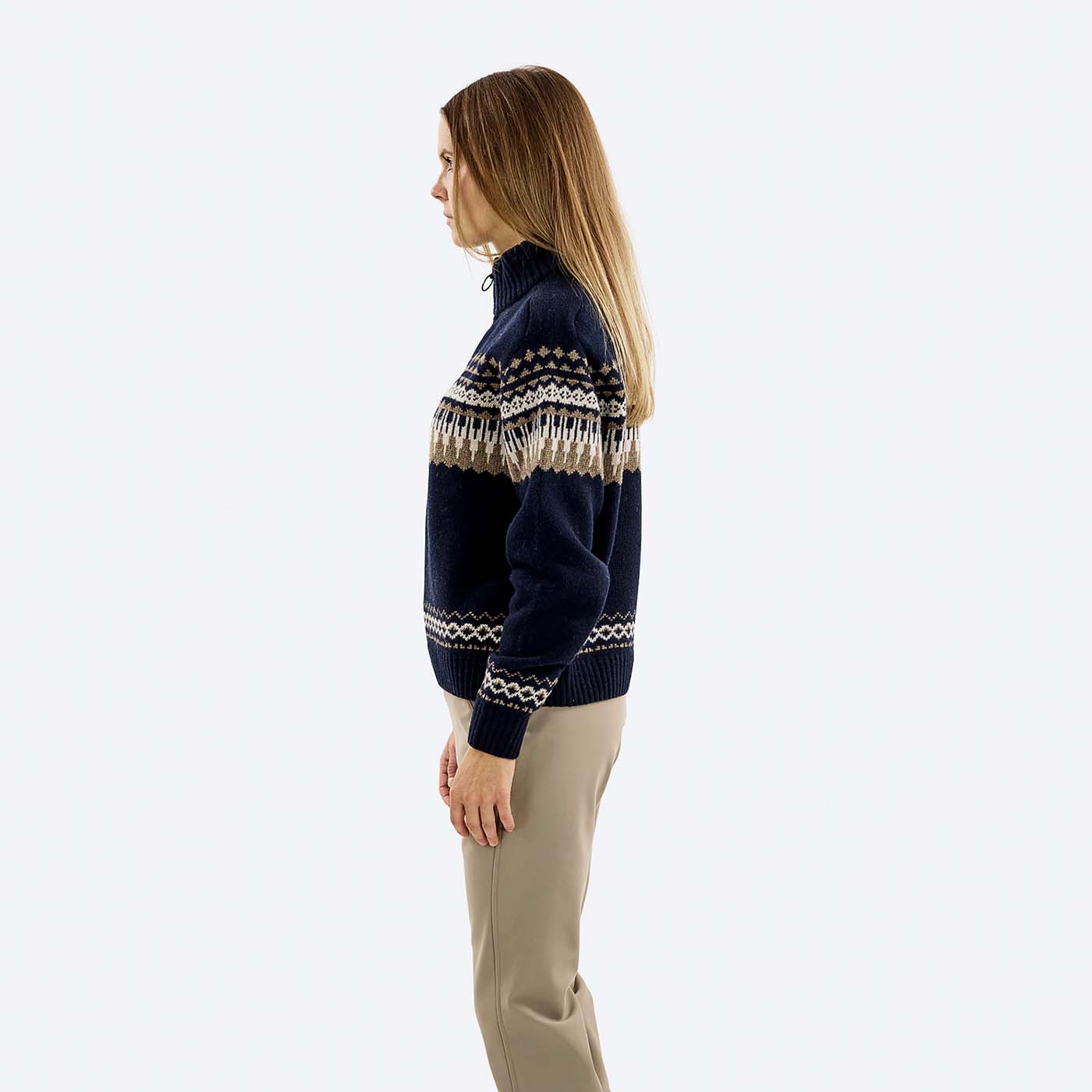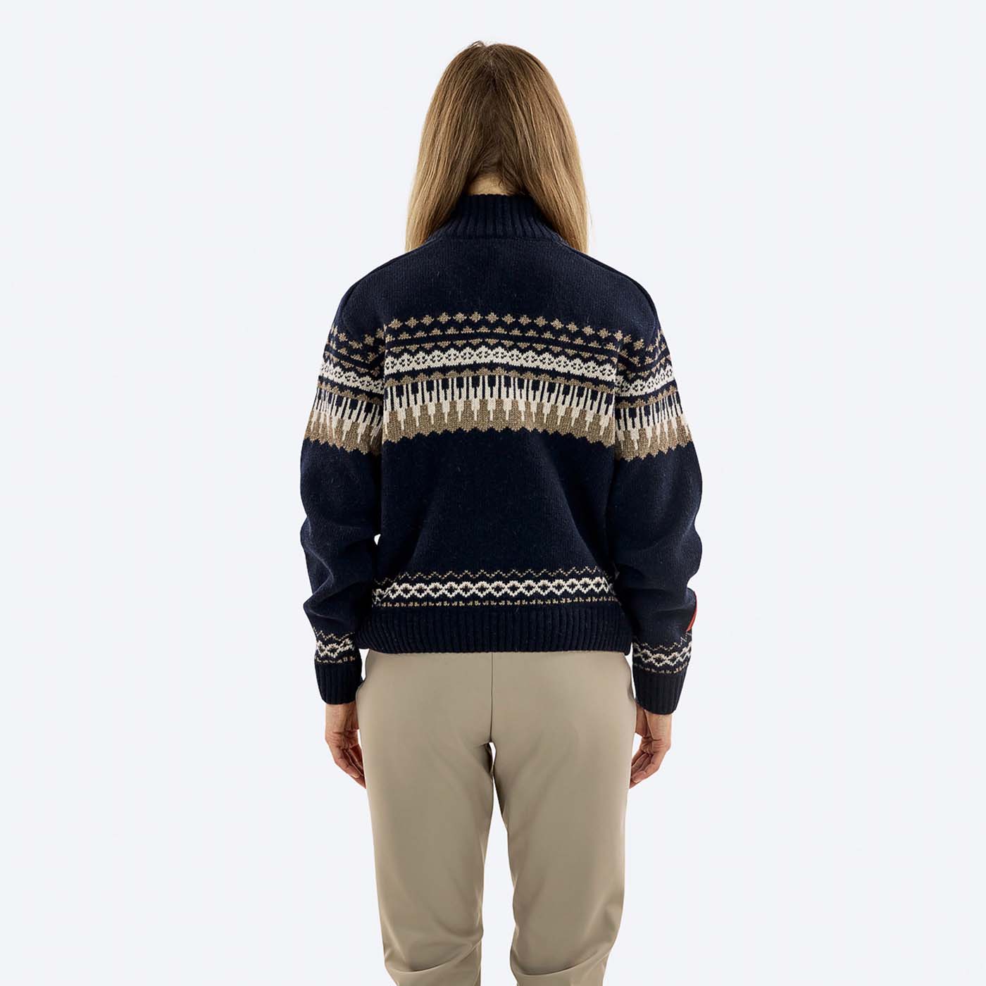 A zippered lambswool sweater with timeless, classic style, designed for comfort on and off the mountain. Featuring a quarter-length zipper and a tall collar, it offers extra warmth on chilly ski days. The slightly shorter, boxy cut adds a modern silhouette to a sweater rooted in tradition and inspired by classic mountain culture.