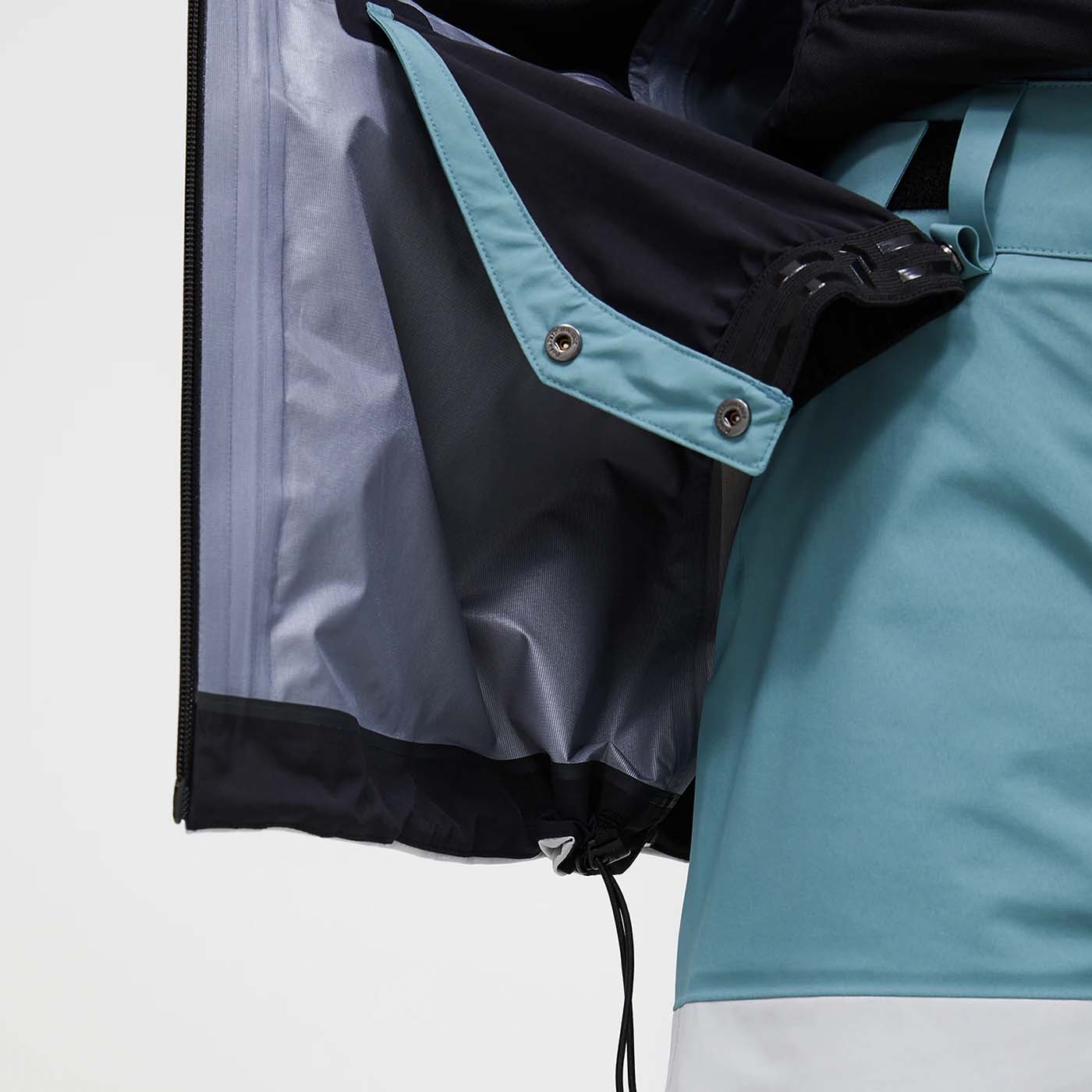 Relaxed silhouette with a dropped hem, articulated sleeves, and room for base, mid, insulation layers, plus back protection.