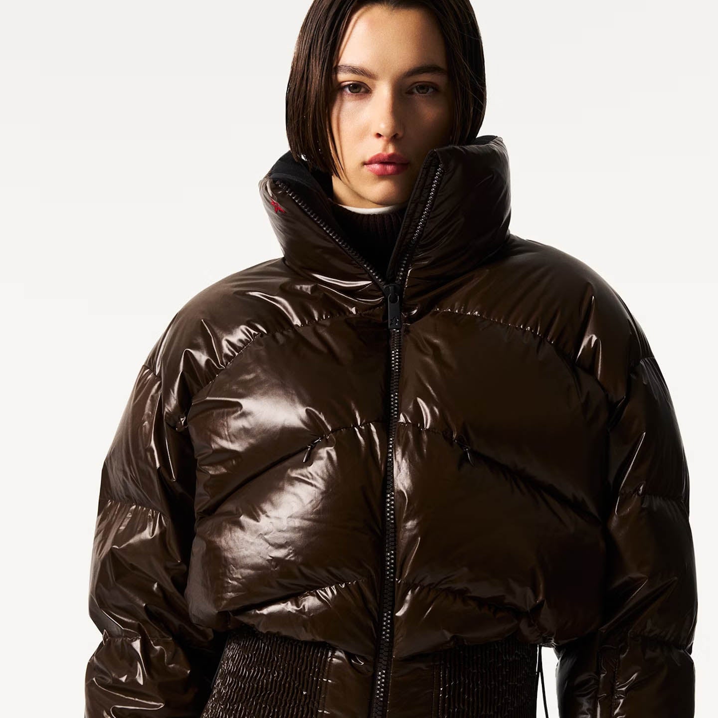 Sleek, sculpted, and slope-ready, the Aureta Ski Jacket brings a fashion-forward edge to high-performance outerwear. Cut to a slightly cropped, fitted silhouette that sits just above the hip, it blends modern style with essential on-mountain functionality. The rich chocolate tone feels timeless and elevated, while the high neck, ribbed cuffs, and adjustable toggle waist create a flattering, cinched shape.