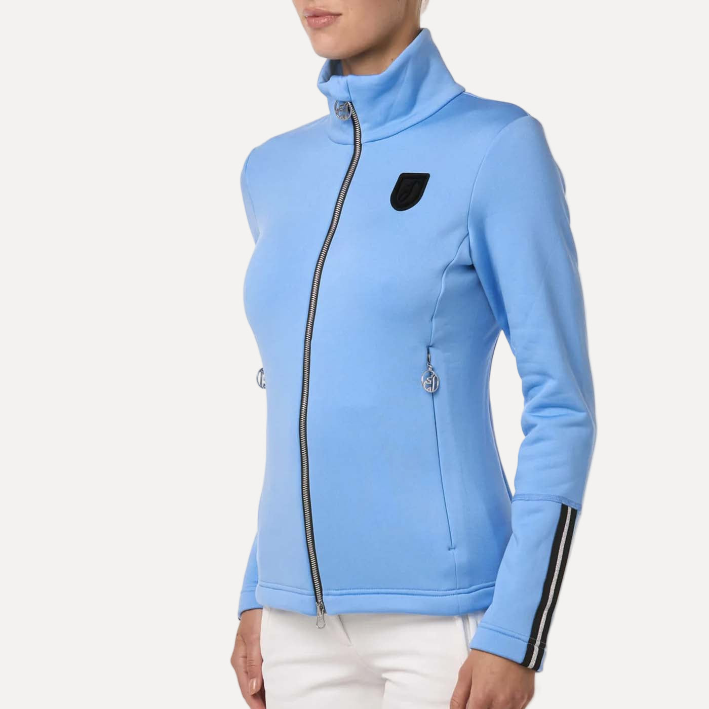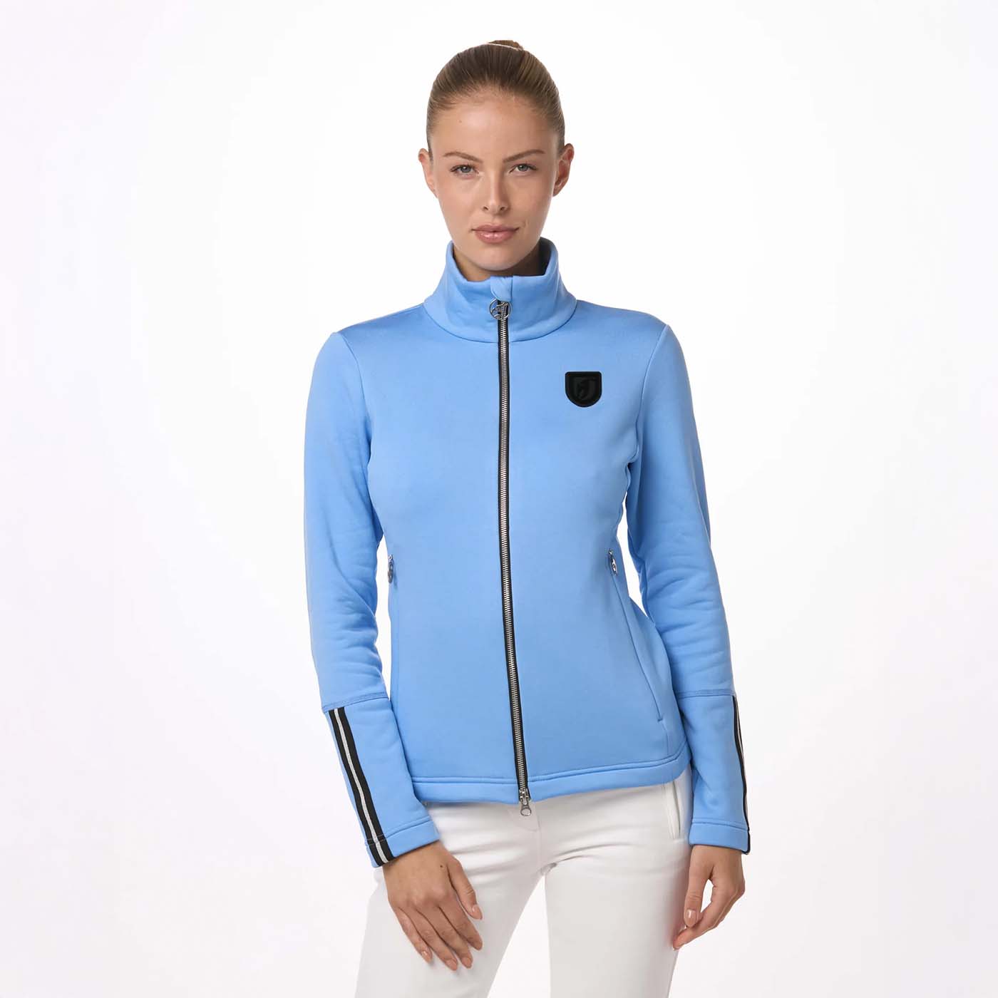 The Kathi mid-layer is made from exquisite Italian power stretch, offering warmth while wicking moisture and drying quickly. The front is finished with a practical yet stylish YKK® 2-way METALUXE® Mirror zipper, while concealed zippers secure the side pockets. Silver-toned stripes at the cuffs add a touch of luxury to this lightweight, high-performance jacket.