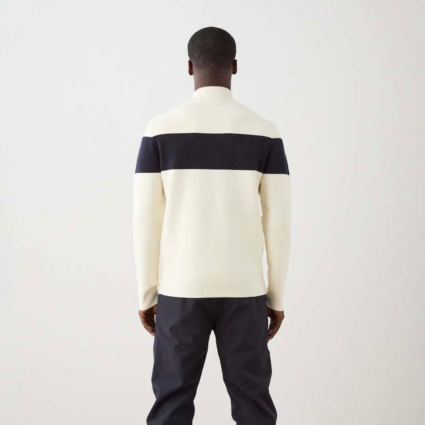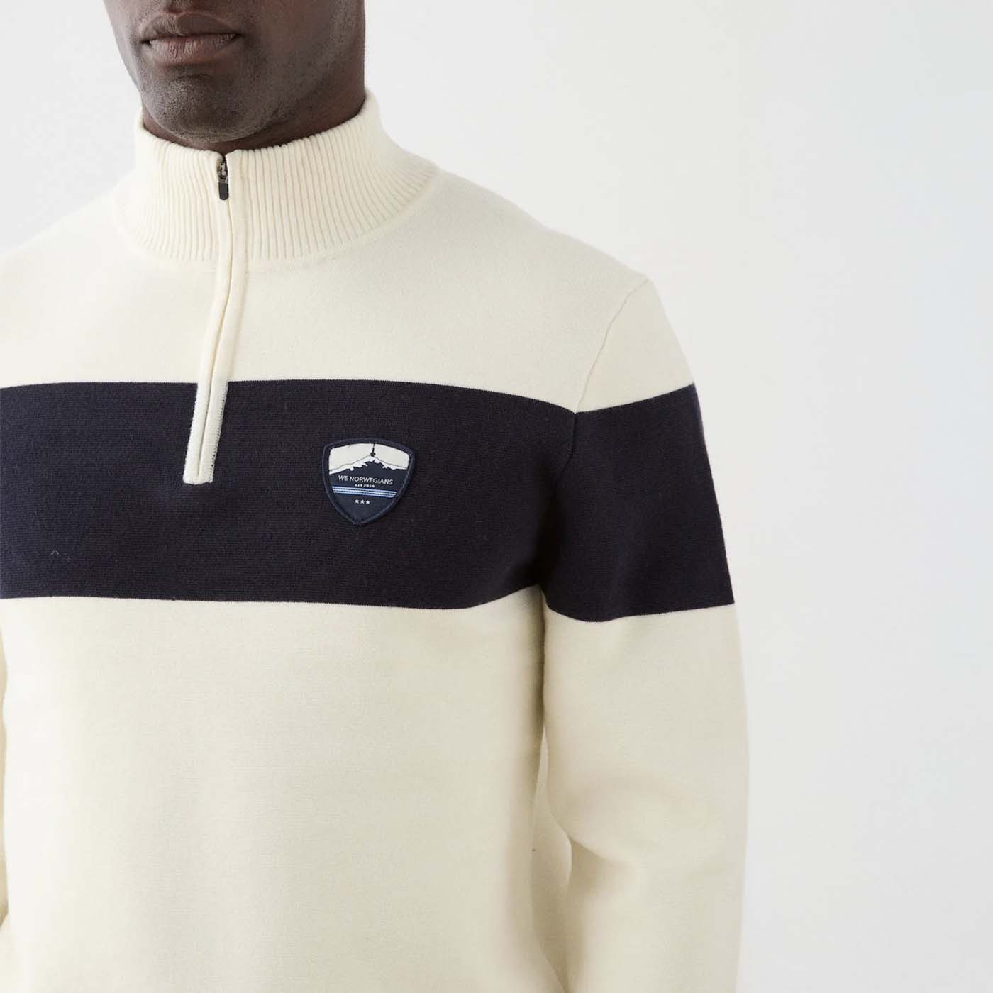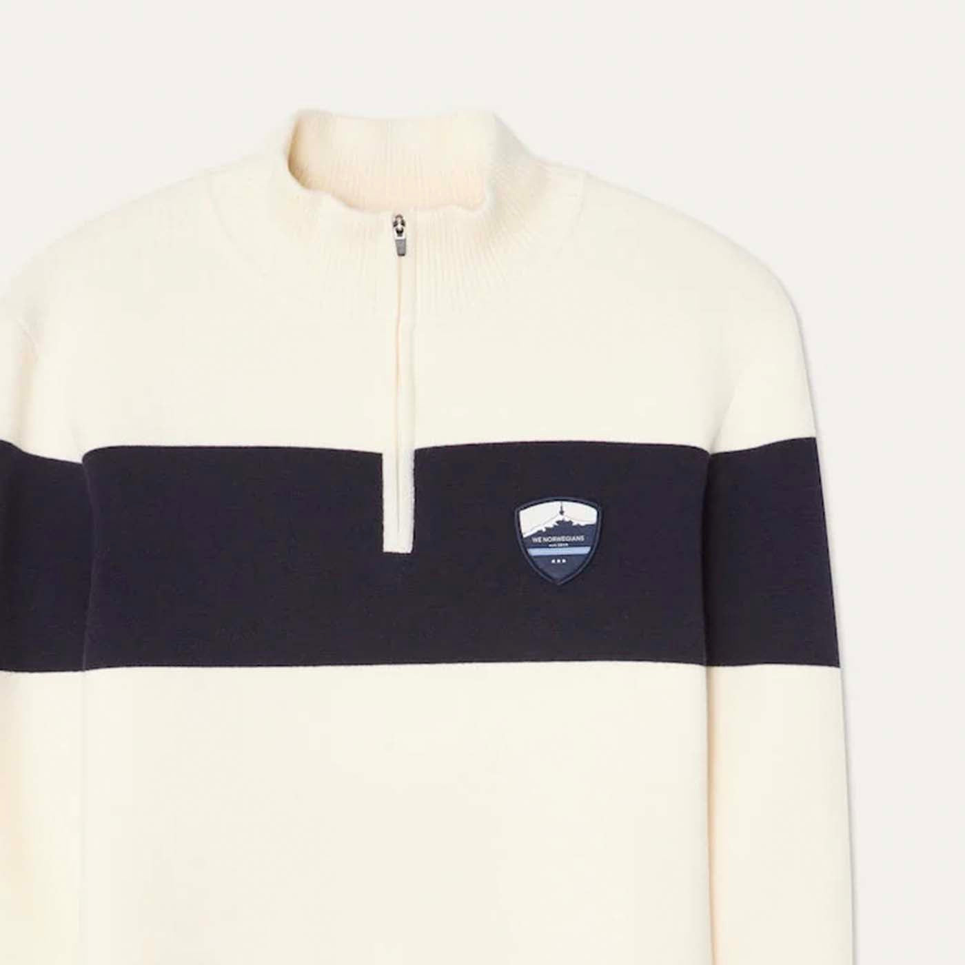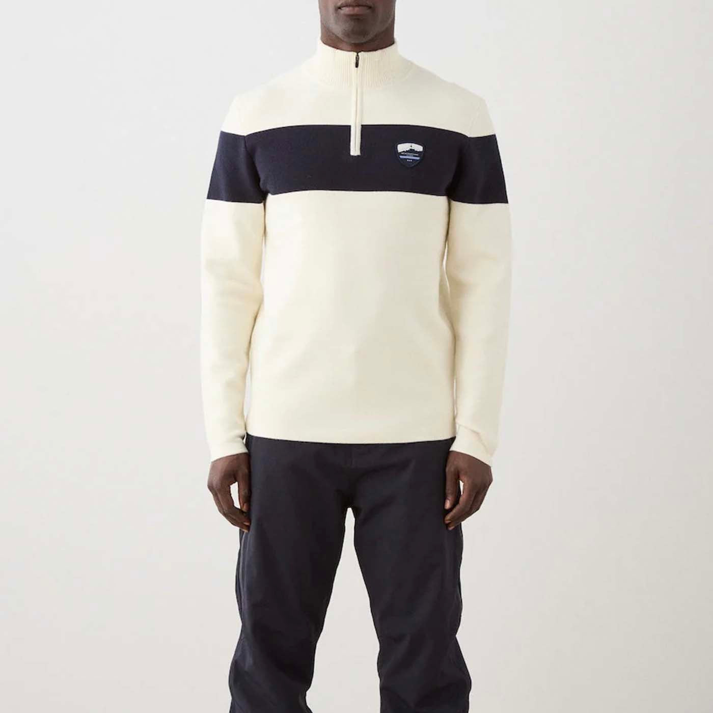 The Holmenkollen Zip-Up Sweater combines modern craftsmanship with vintage ski heritage. Knitted in a luxurious merino wool and cotton blend using a Milano stitch, it delivers a smooth, structured feel that is both breathable and insulating. Inspired by the team sweaters worn by competitive skiers in the 1970s, it features a bold contrasting panel across the chest and sleeves, along with a retro-inspired badge for an authentic alpine touch. Finished with a sporty zip-up collar creating a polished, après-ski-ready look.
