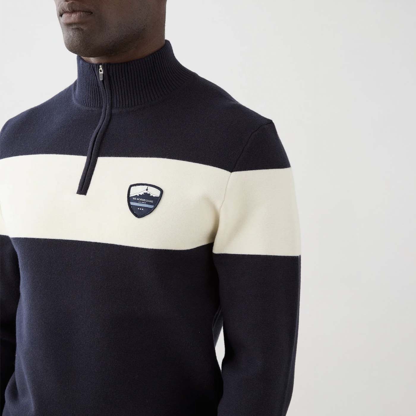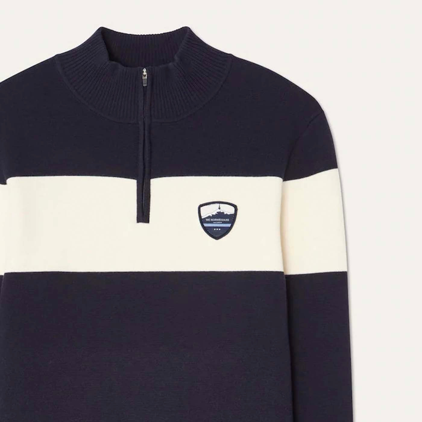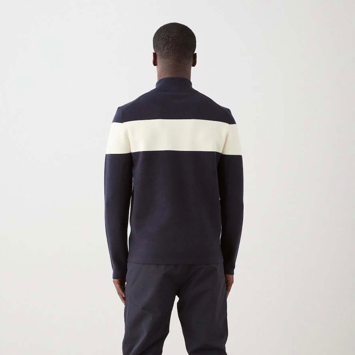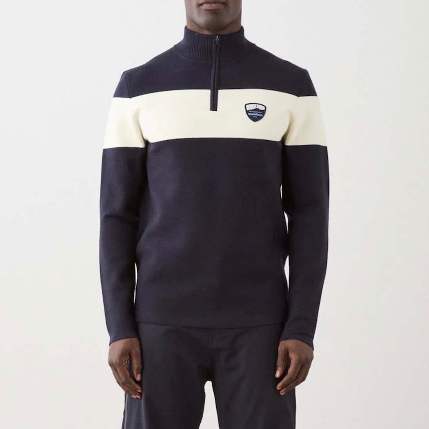 The Holmenkollen Zip-Up Sweater combines modern craftsmanship with vintage ski heritage. Knitted in a luxurious merino wool and cotton blend using a Milano stitch, it delivers a smooth, structured feel that is both breathable and insulating. Inspired by the team sweaters worn by competitive skiers in the 1970s, it features a bold contrasting panel across the chest and sleeves, along with a retro-inspired badge for an authentic alpine touch. Finished with a sporty zip-up collar creating a polished, après-ski-ready look.