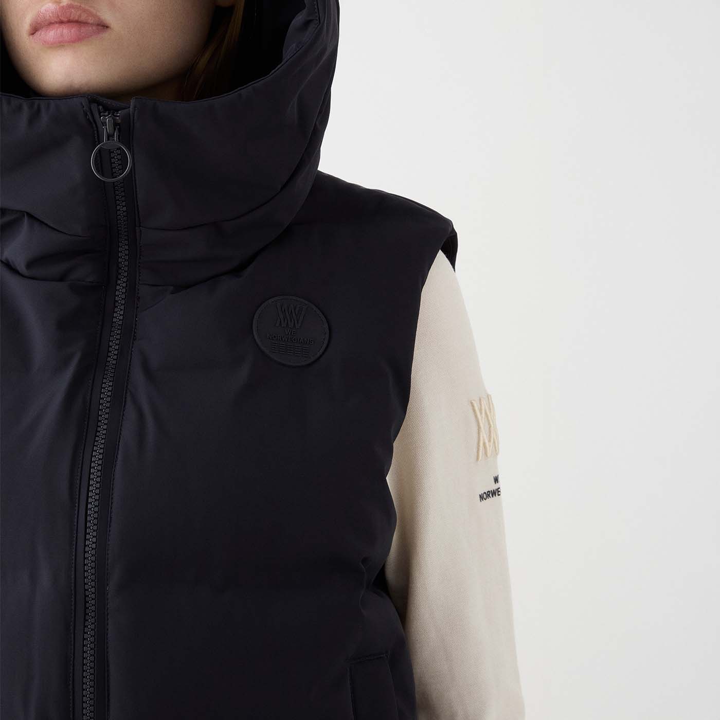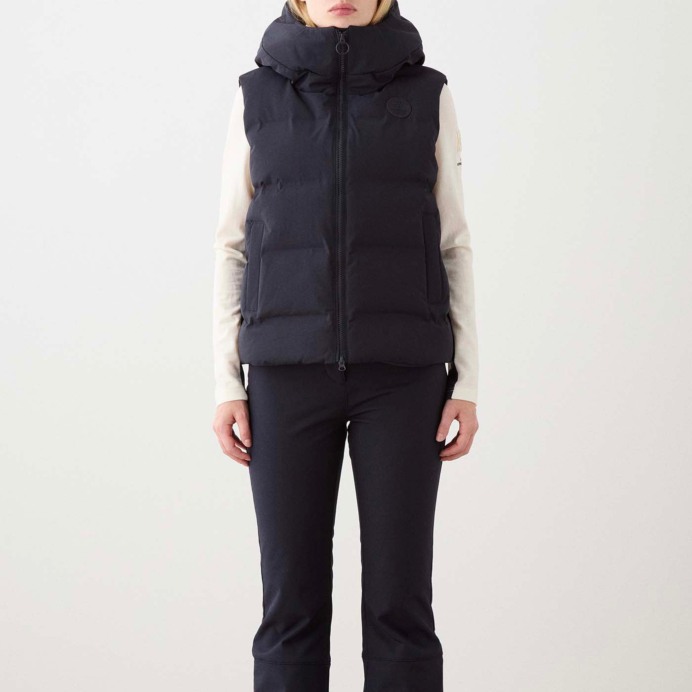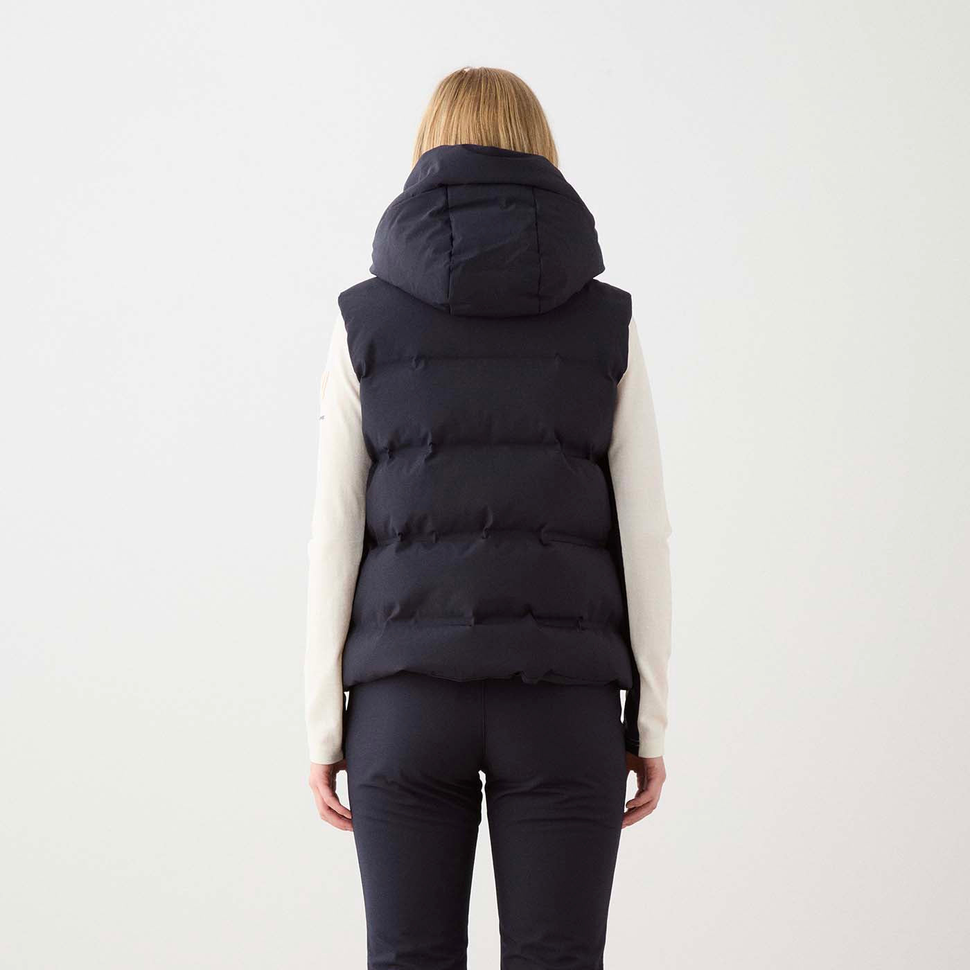 Engineered with welded “seams” between the air pockets, this vest enhances its sleek Scandinavian aesthetic while boosting durability and functional comfort. A spacious, snug hood fits over a ski helmet when worn on the mountain, and a subtle A-line silhouette combined with zipped front pockets ensures a balance of style and practicality.