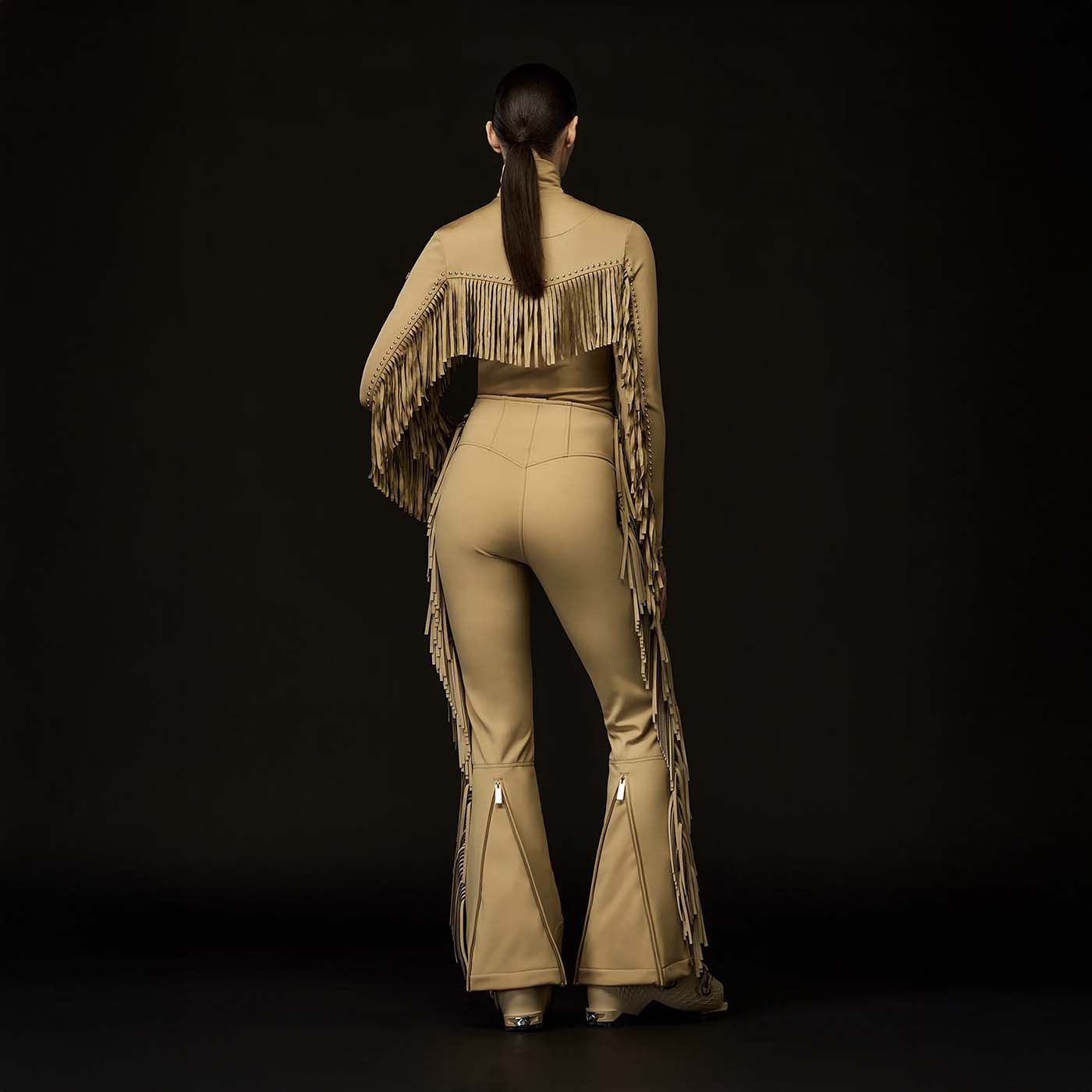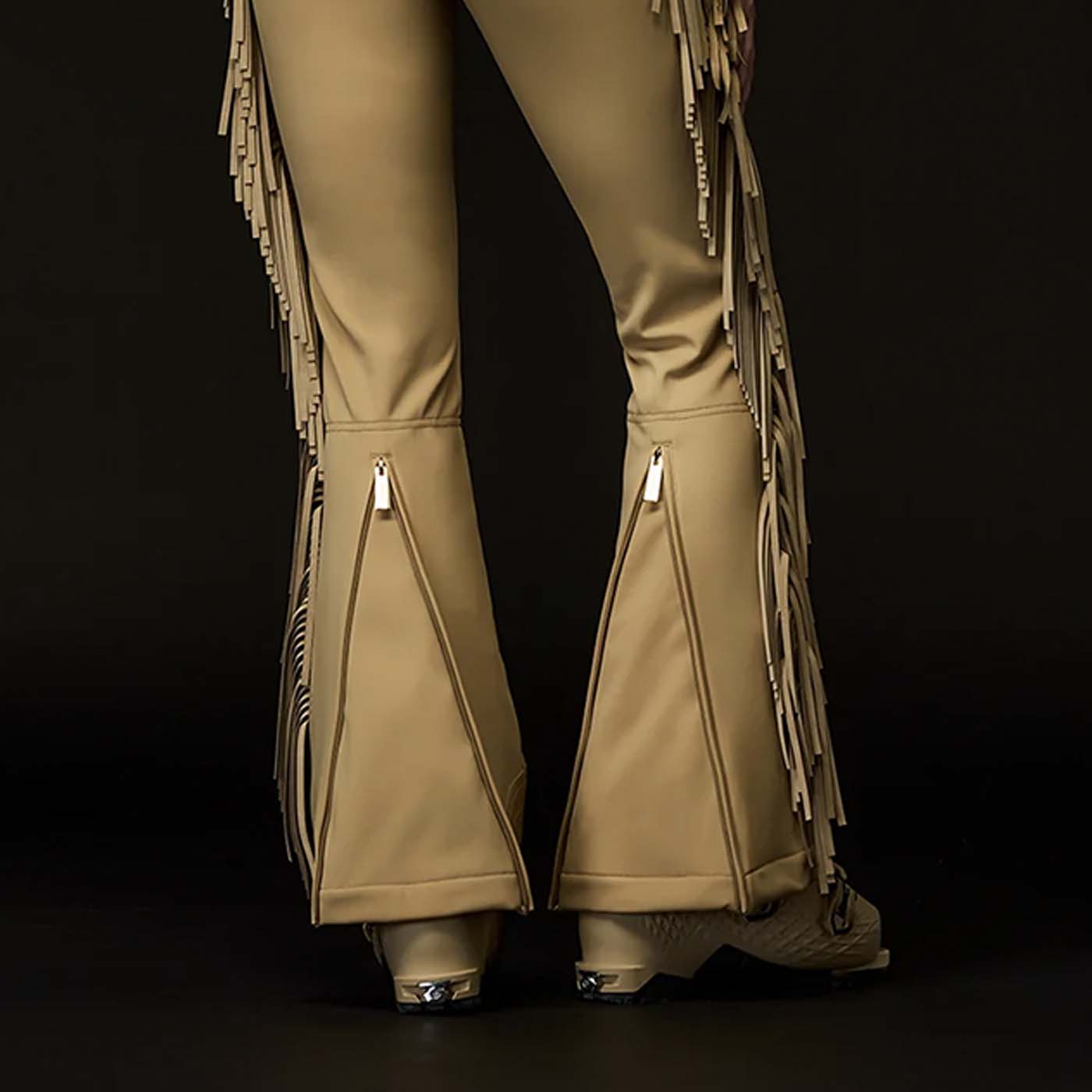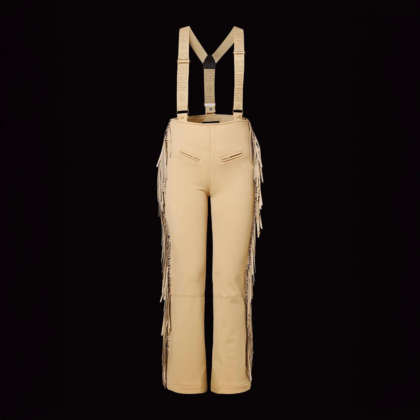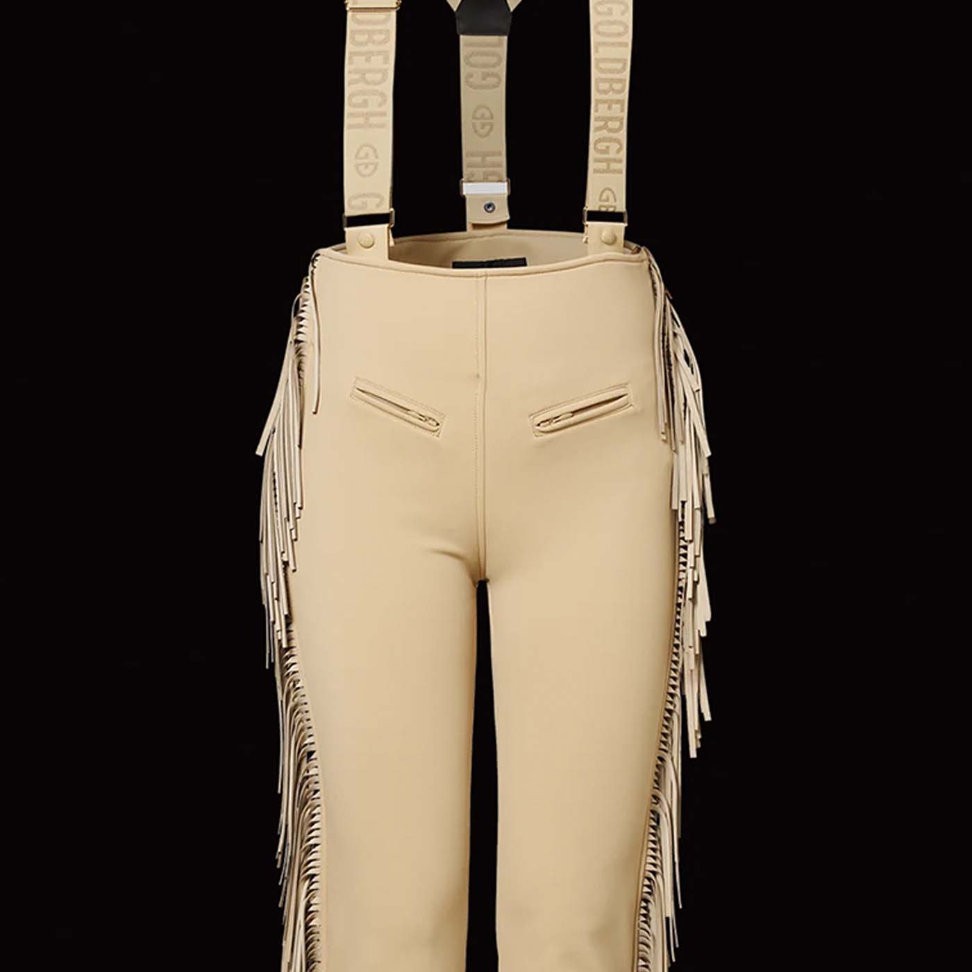 These ski salopettes with fringes on the sides combine style and functionality for the slopes. Featuring two pockets, elastic suspenders, and built-in snowcatchers, they provide comfort and protection. Zippers at the legs make them easy to put on, while decorative fringes along the sides add a playful, distinctive touch.