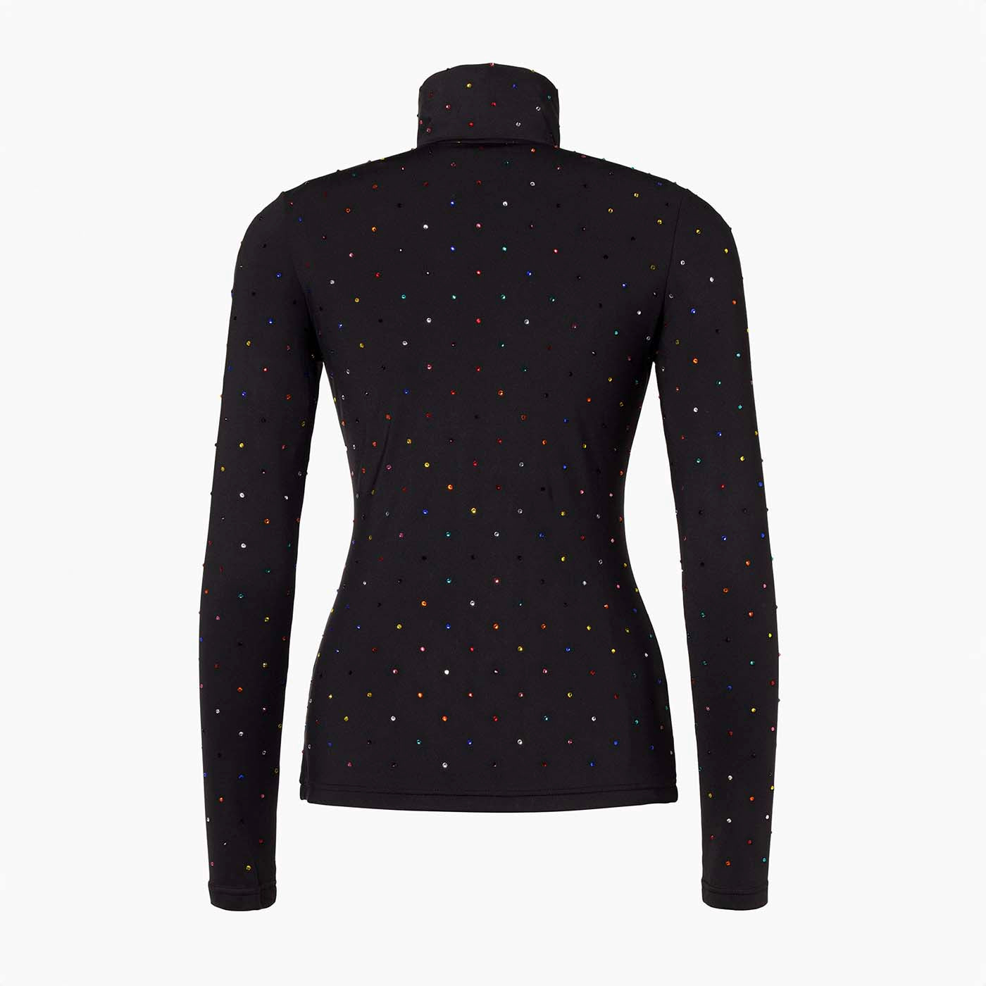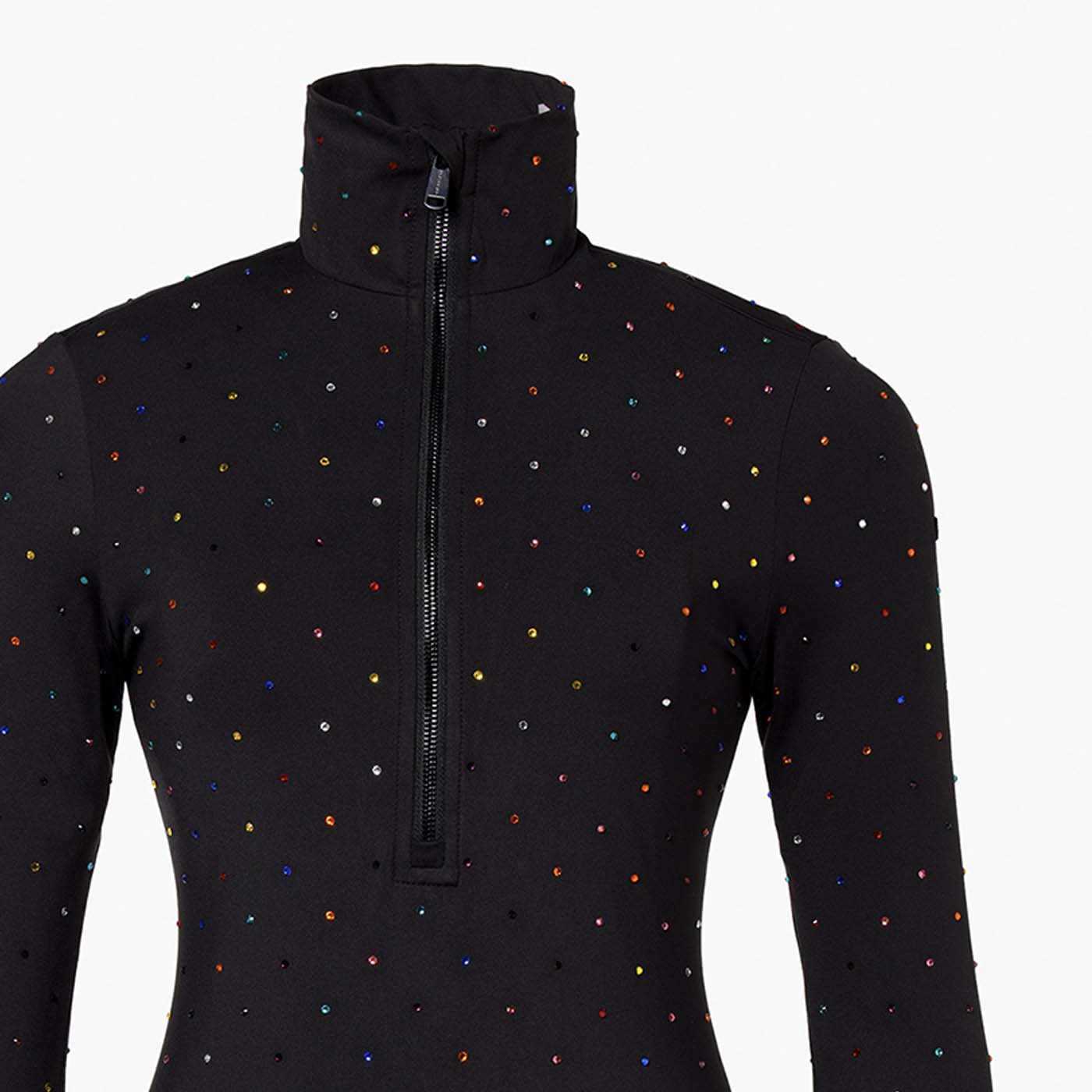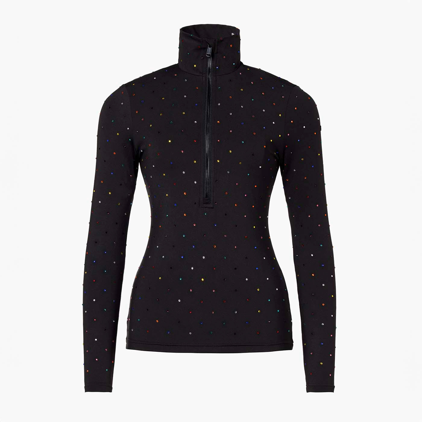 The Multicolour Sparkling Ski Pully is crafted from powerstretch interlock fabric with a soft brushed back for warmth and comfort. Featuring a close-fitting collar and a longer front ½ zip, it combines function with style. Adorned with all-over multicoloured strass stones, the design is finished with a metal brand label on the upper sleeve.