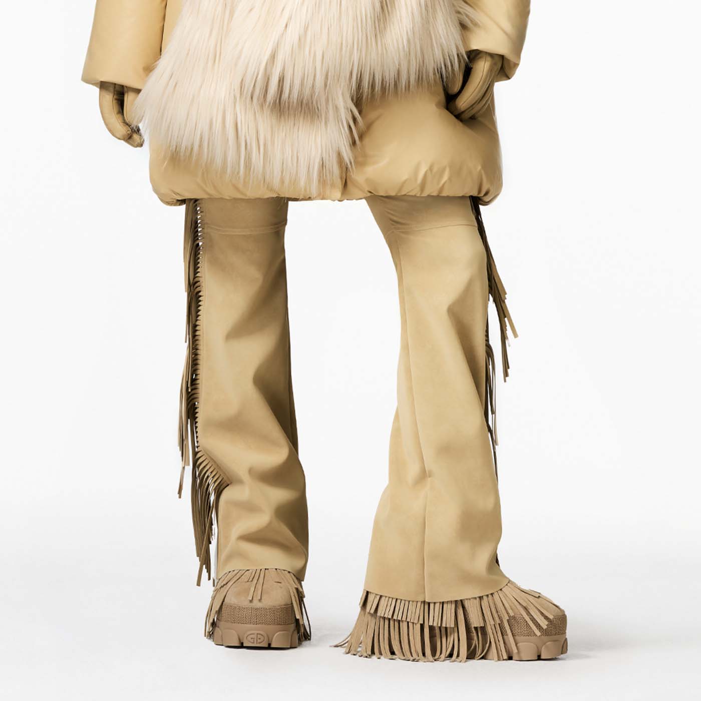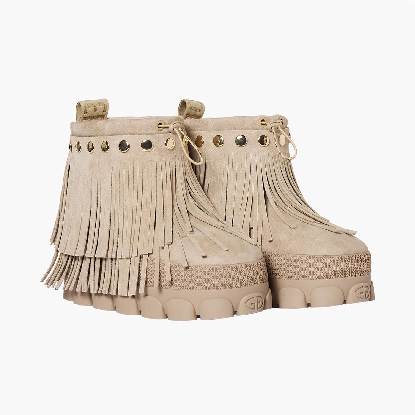 This low snow boot brings style and function together, featuring a chunky outsole and waterproof inner construction for reliable winter protection. Designed with removable suede fringes with studs along the top opening, it offers a playful, customizable look. An elastic loop at the back shaft makes it easy to slip on, while the upper blends faux suede, cow leather, polyester, and polyamide, finished with 100% real suede fringe for added texture and detail.