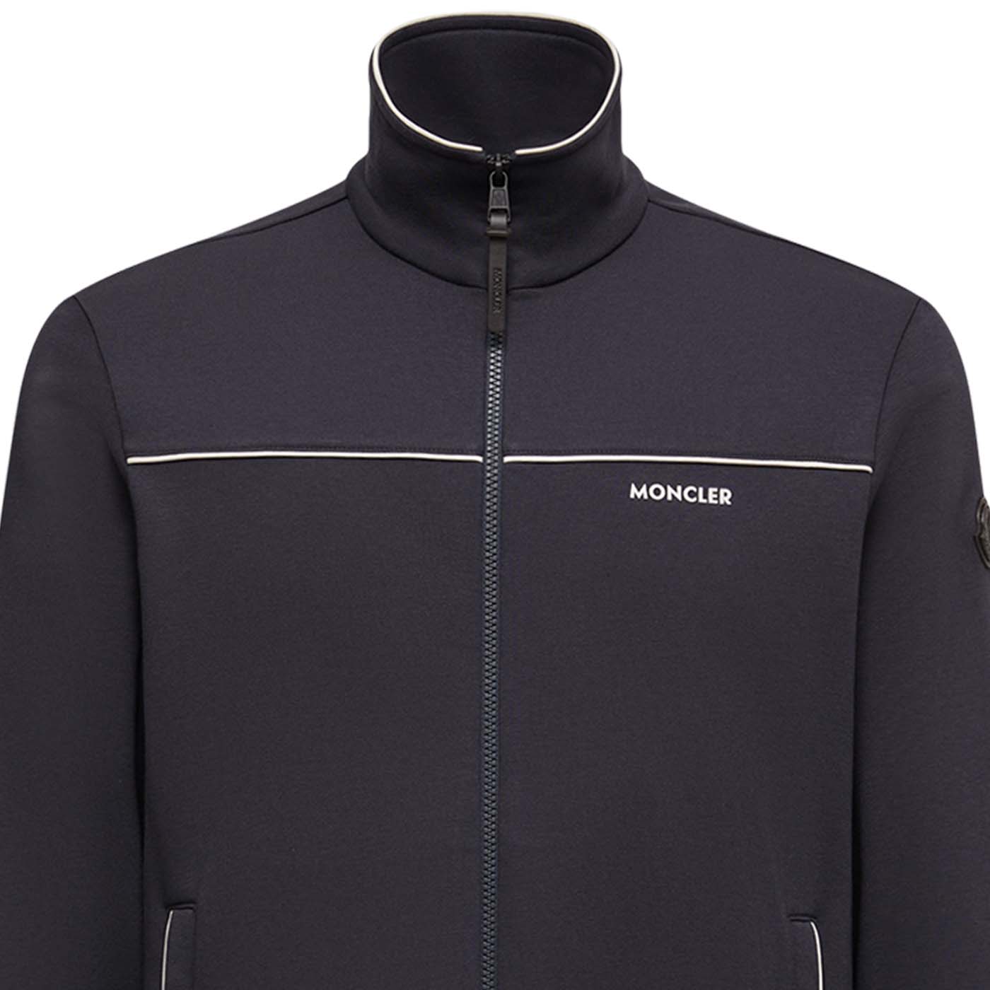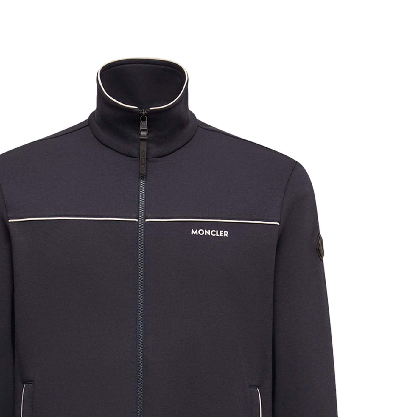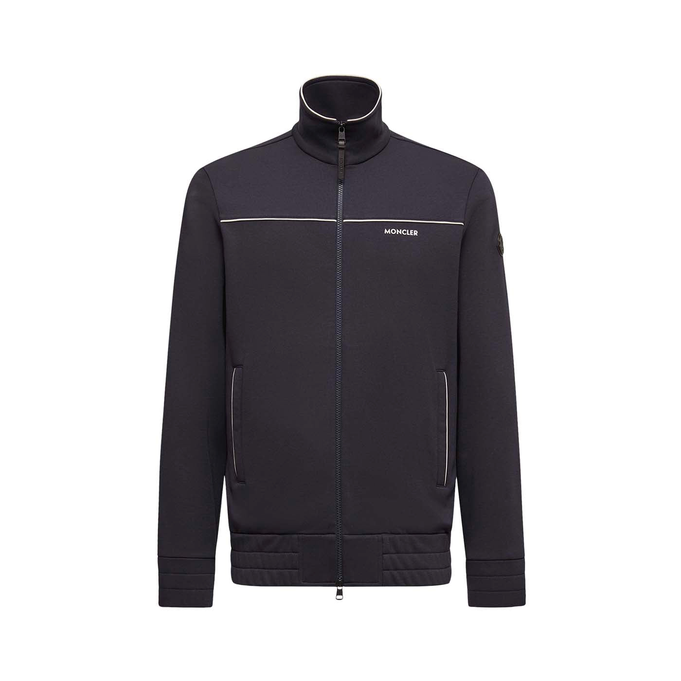 Refined performance meets everyday luxury in this Moncler zip-up jacket. Crafted from smooth, structured technical fabric, the design features a sleek stand collar and a streamlined silhouette for a modern, versatile look. A contrast horizontal trim across the chest adds subtle definition, while the discreet Moncler logo enhances the piece with a signature finish.