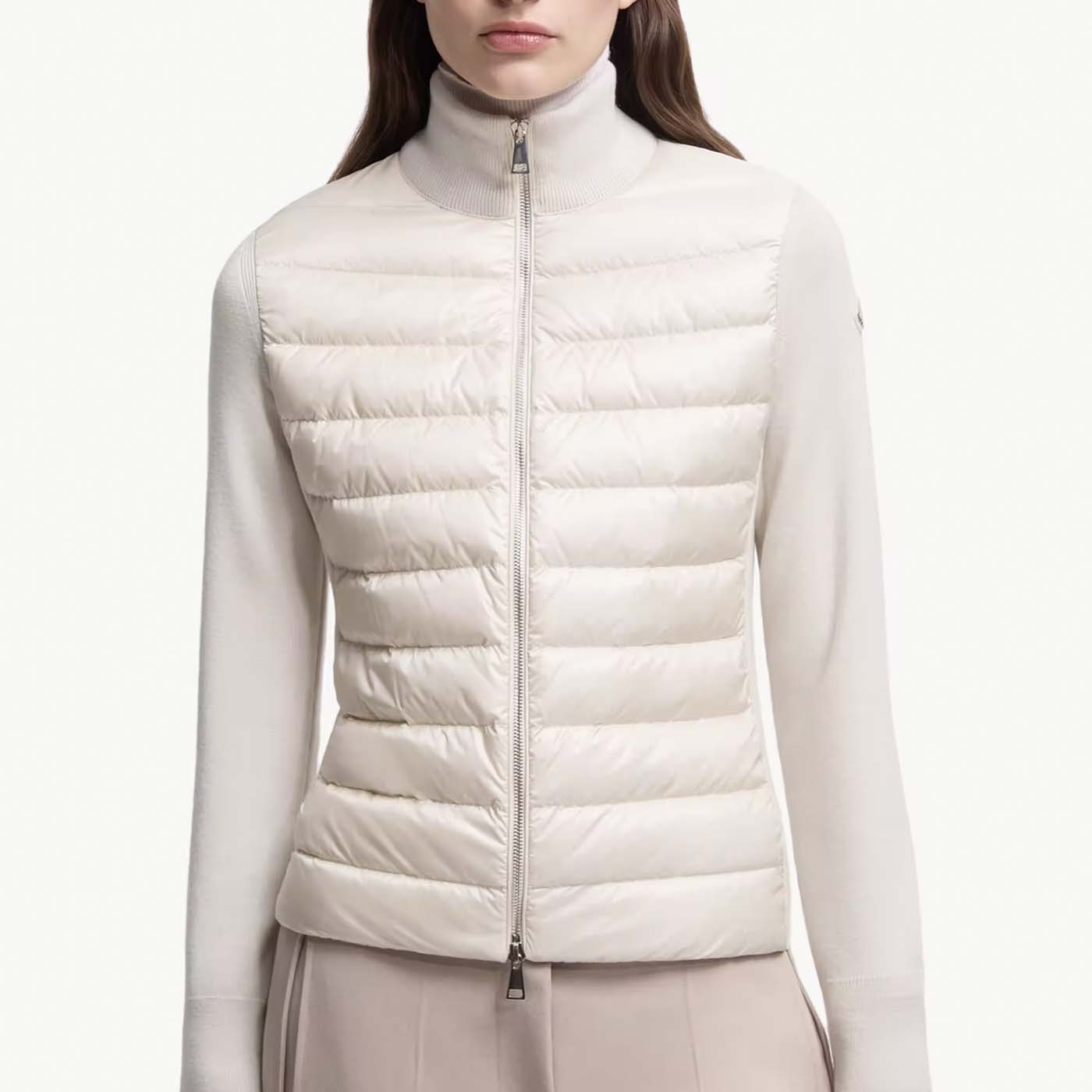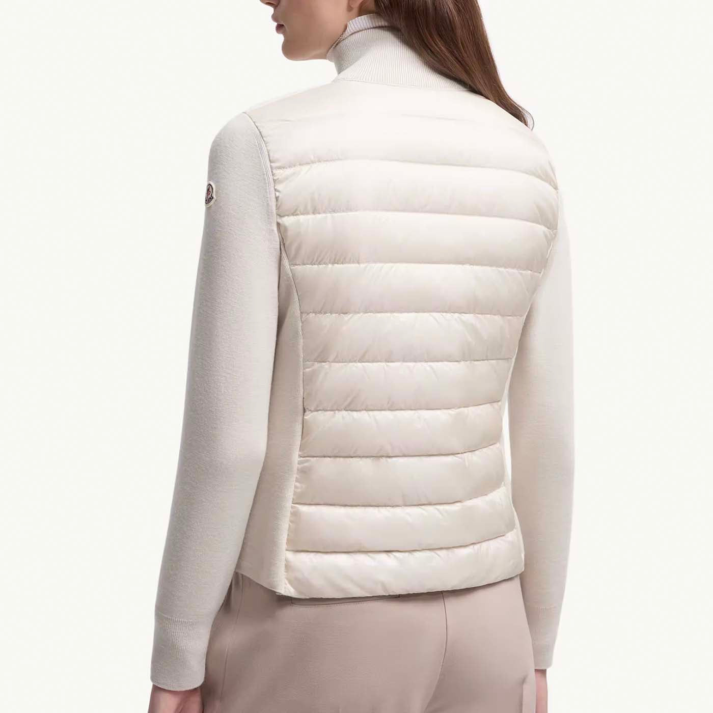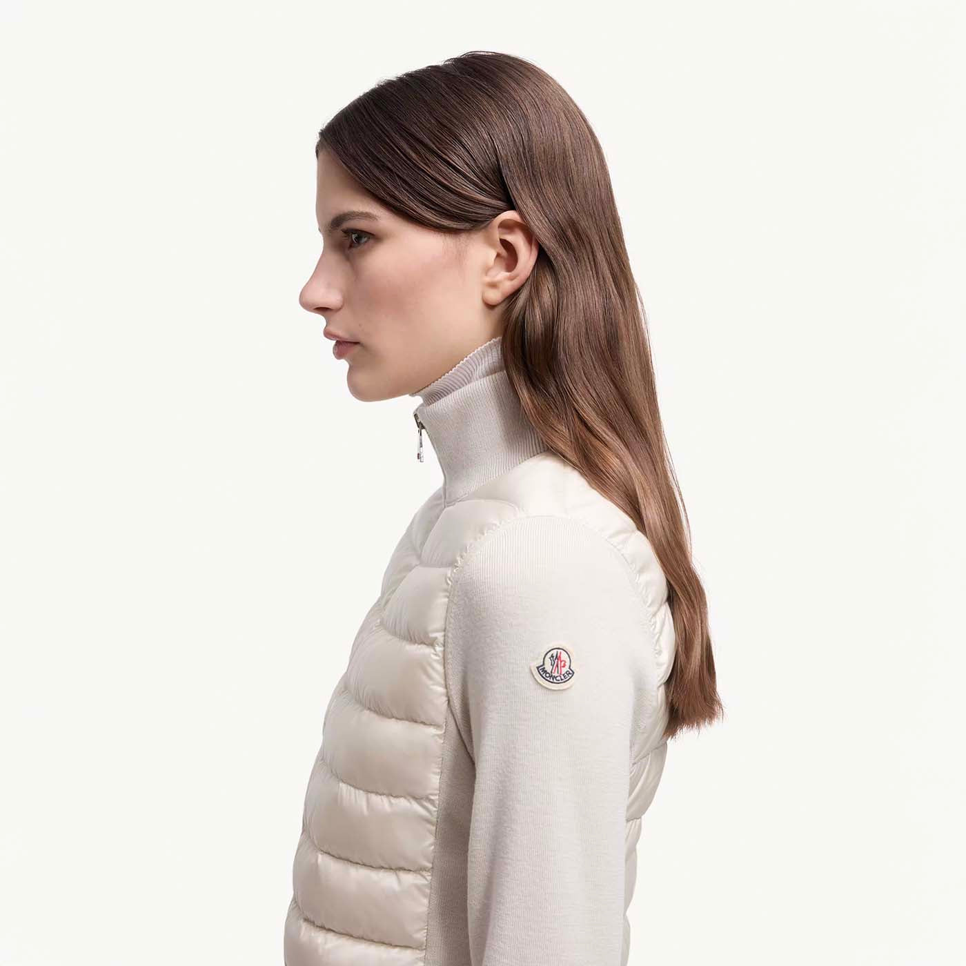 Easily doubling as outerwear when the weather allows, this women’s wool cardigan blends knitwear softness with the warmth of a down-filled longue saison front. Crafted from ultra-fine wool, the lightweight zip-up features a high neck for extra coziness and a sleek, minimal silhouette. A refined layering piece, it transitions effortlessly through shifting seasons and temperature changes.