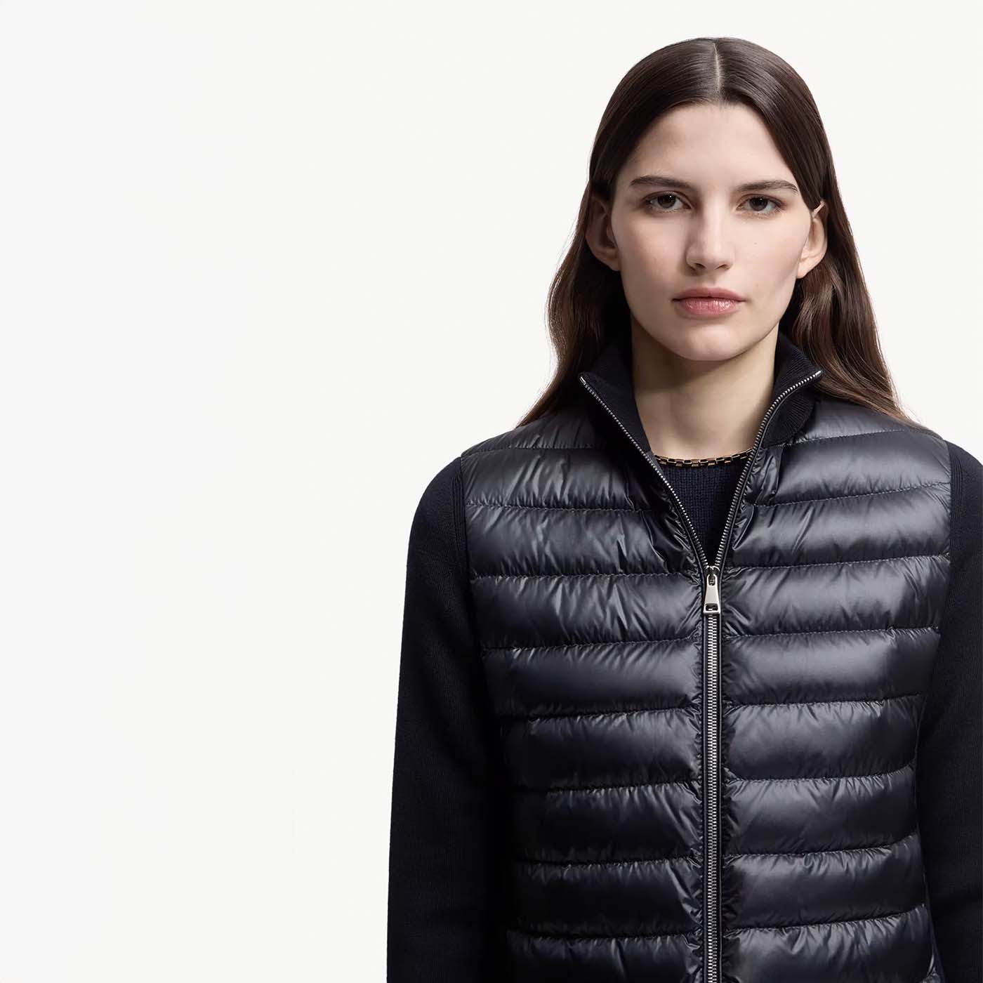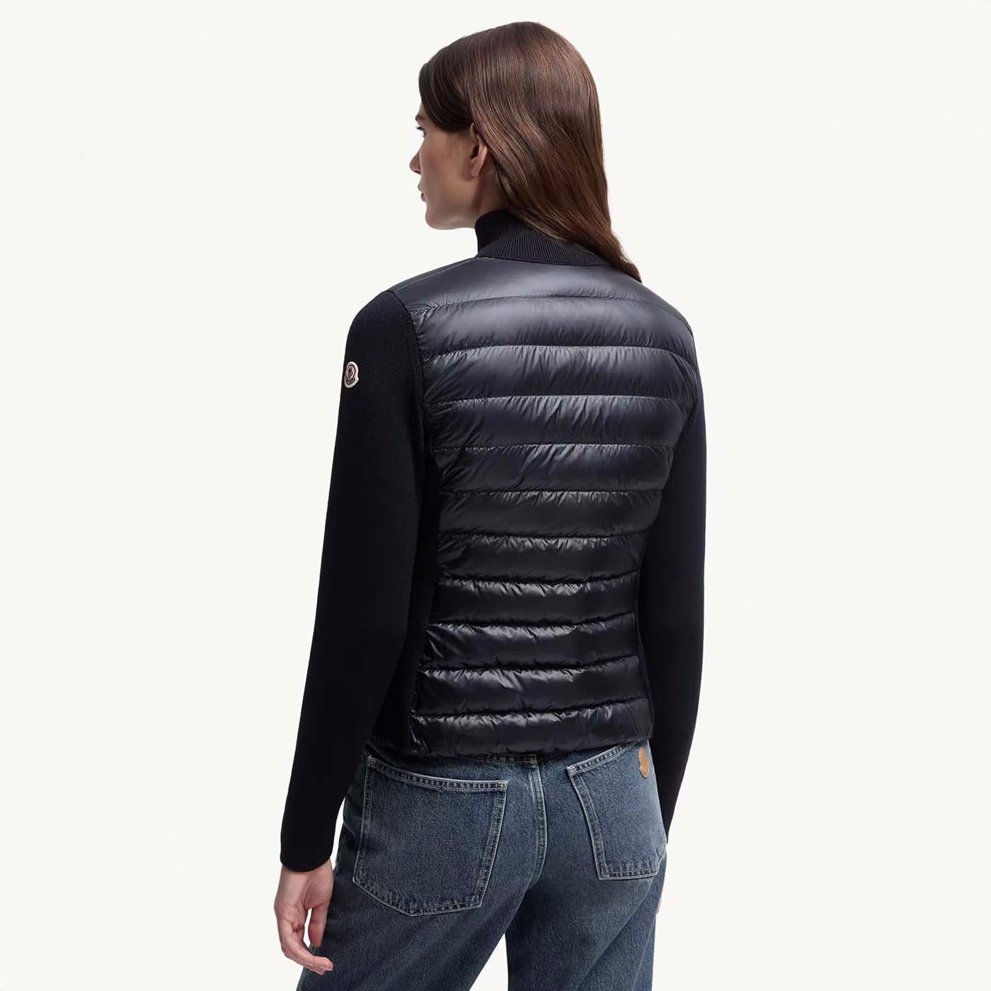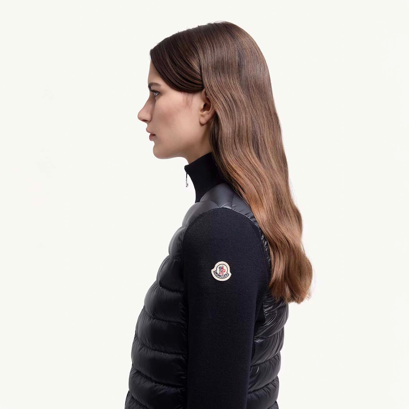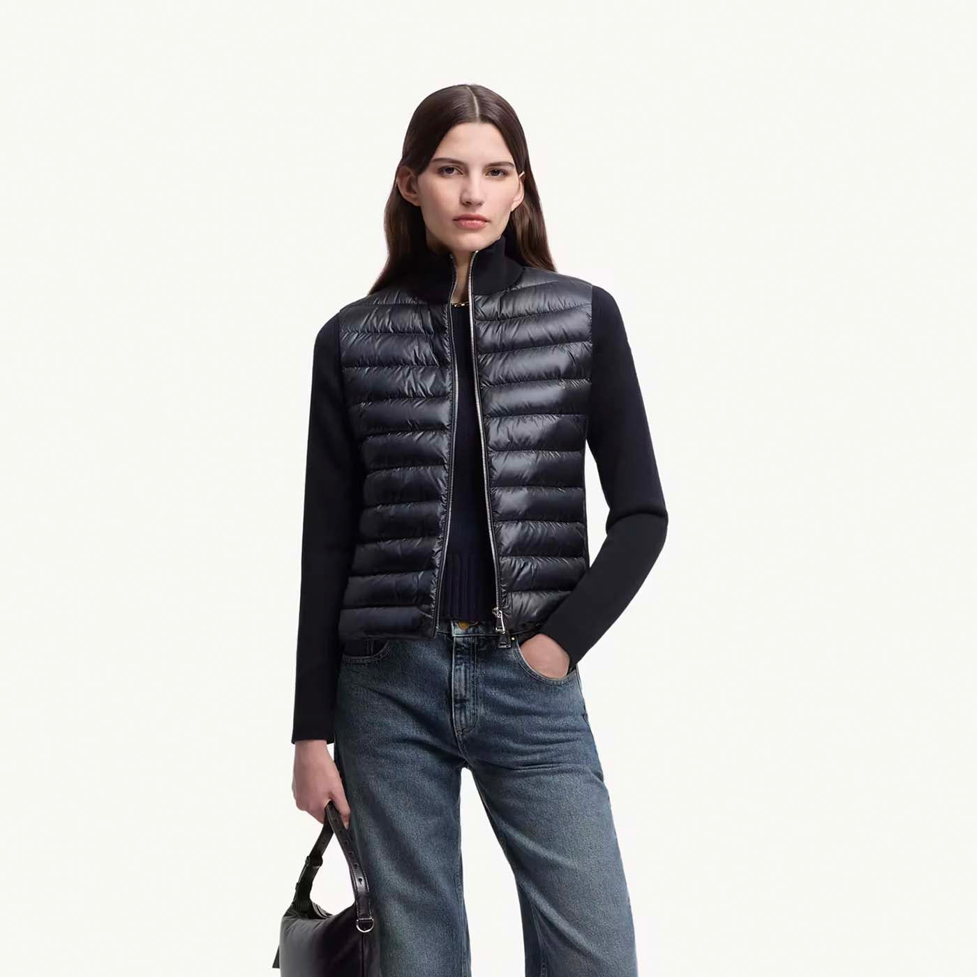 Easily doubling as outerwear when the weather allows, this women’s wool cardigan blends knitwear softness with the warmth of a down-filled longue saison front. Crafted from ultra-fine wool, the lightweight zip-up features a high neck for extra coziness and a sleek, minimal silhouette. A refined layering piece, it transitions effortlessly through shifting seasons and temperature changes.