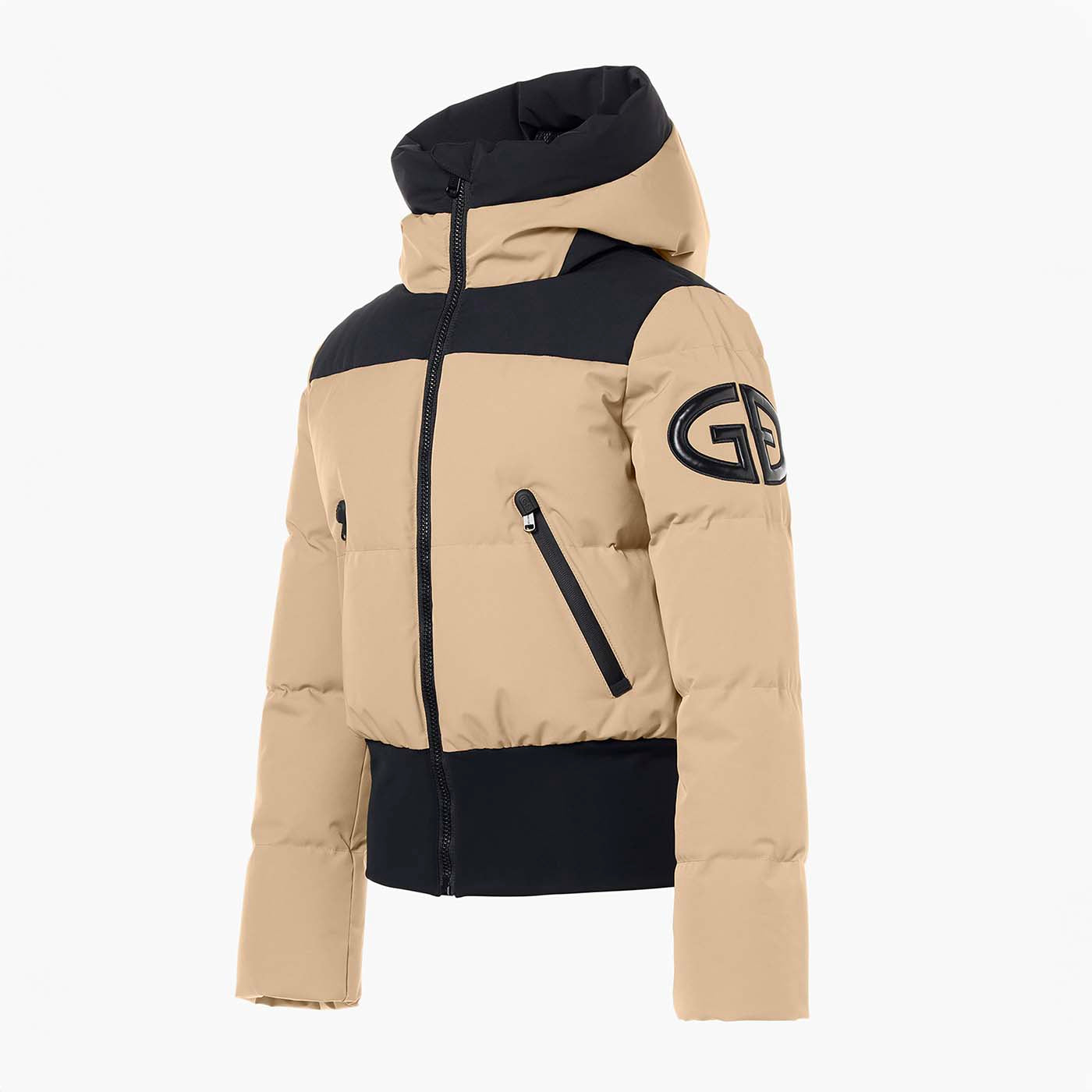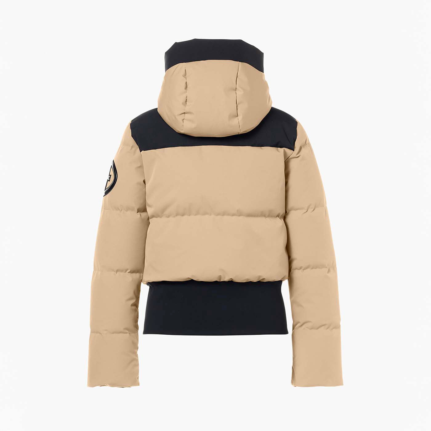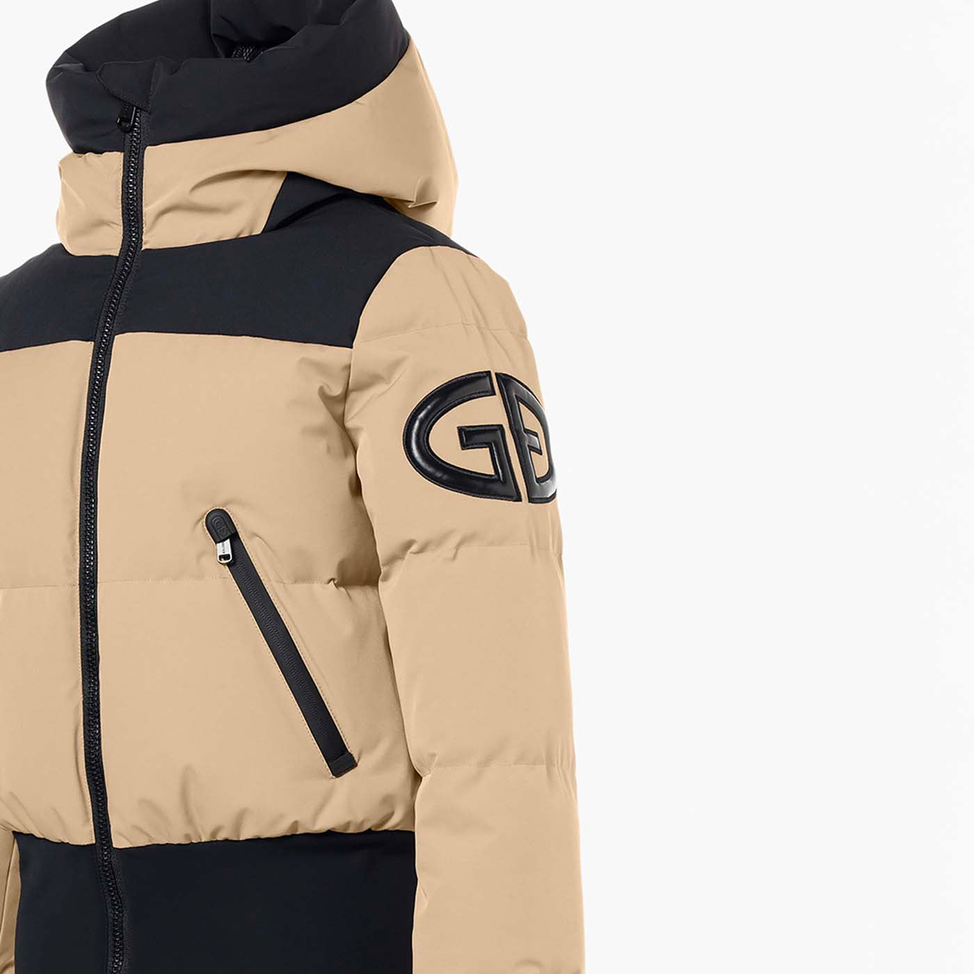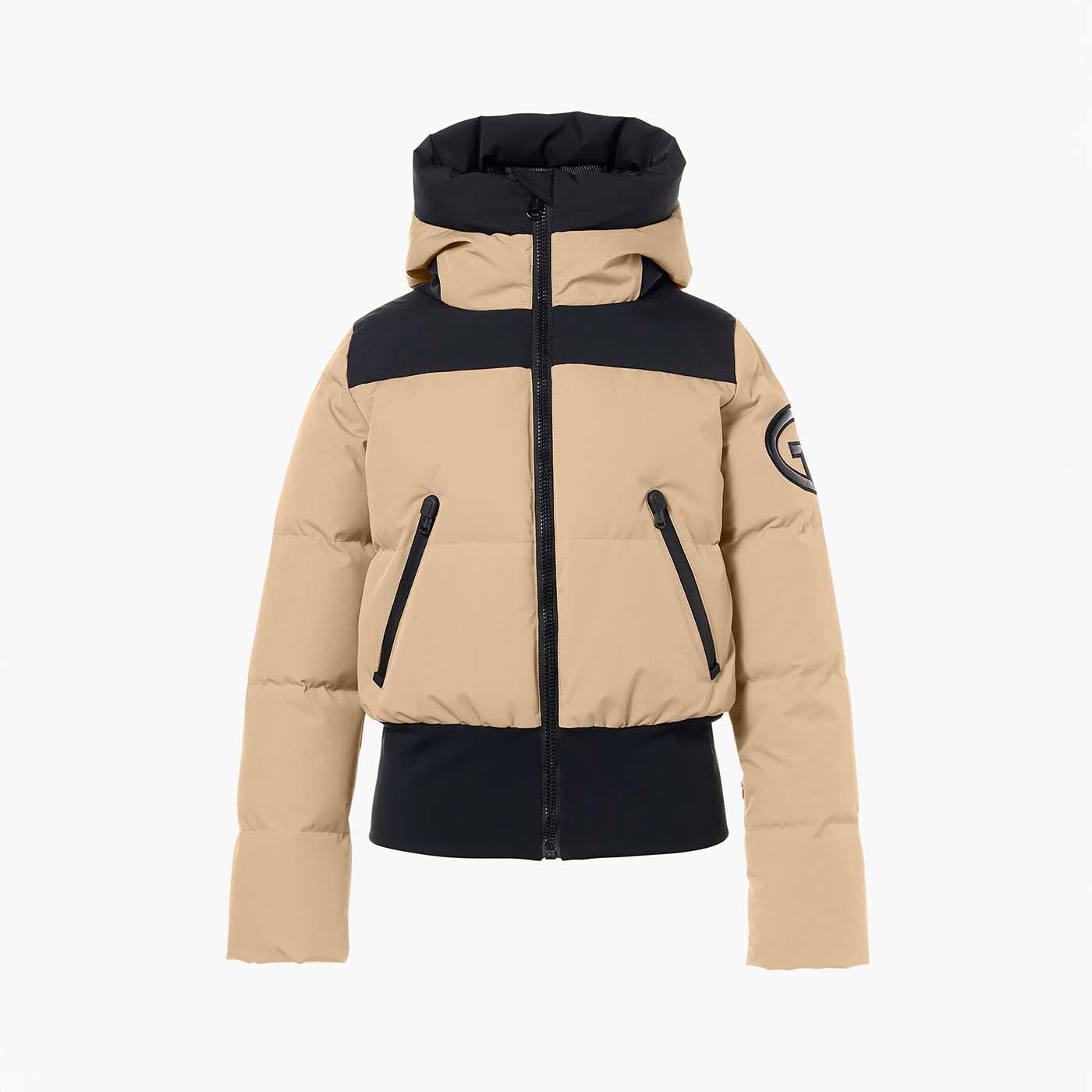 This quilted down bomber jacket with a hood combines warmth, comfort, and a sleek finish. Crafted from partly recycled outer shell fabric with a partly recycled lining featuring an anti-odor finish, it’s insulated with RDS-certified down for superior warmth. Designed for functionality, it includes two outer pockets, two inner pockets, and a sleeve pocket for a ski pass. A fixed hood and knitted inner cuffs provide added protection against the cold.