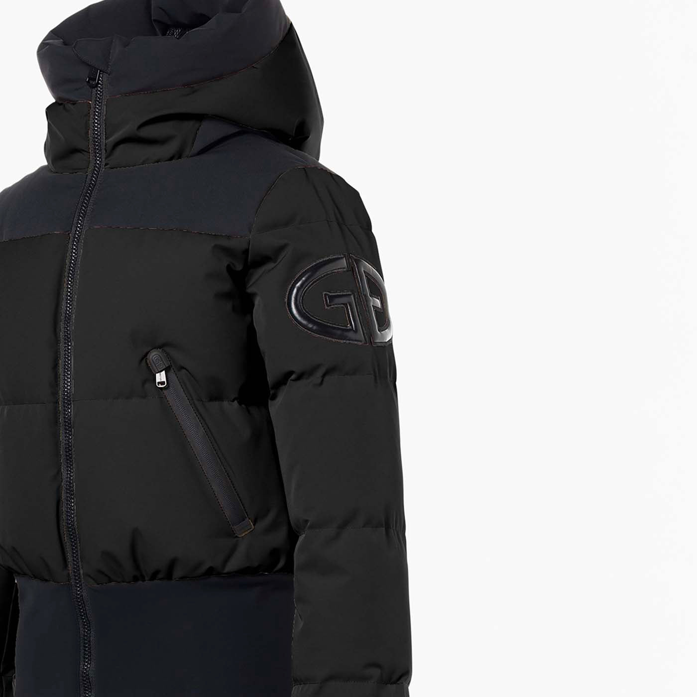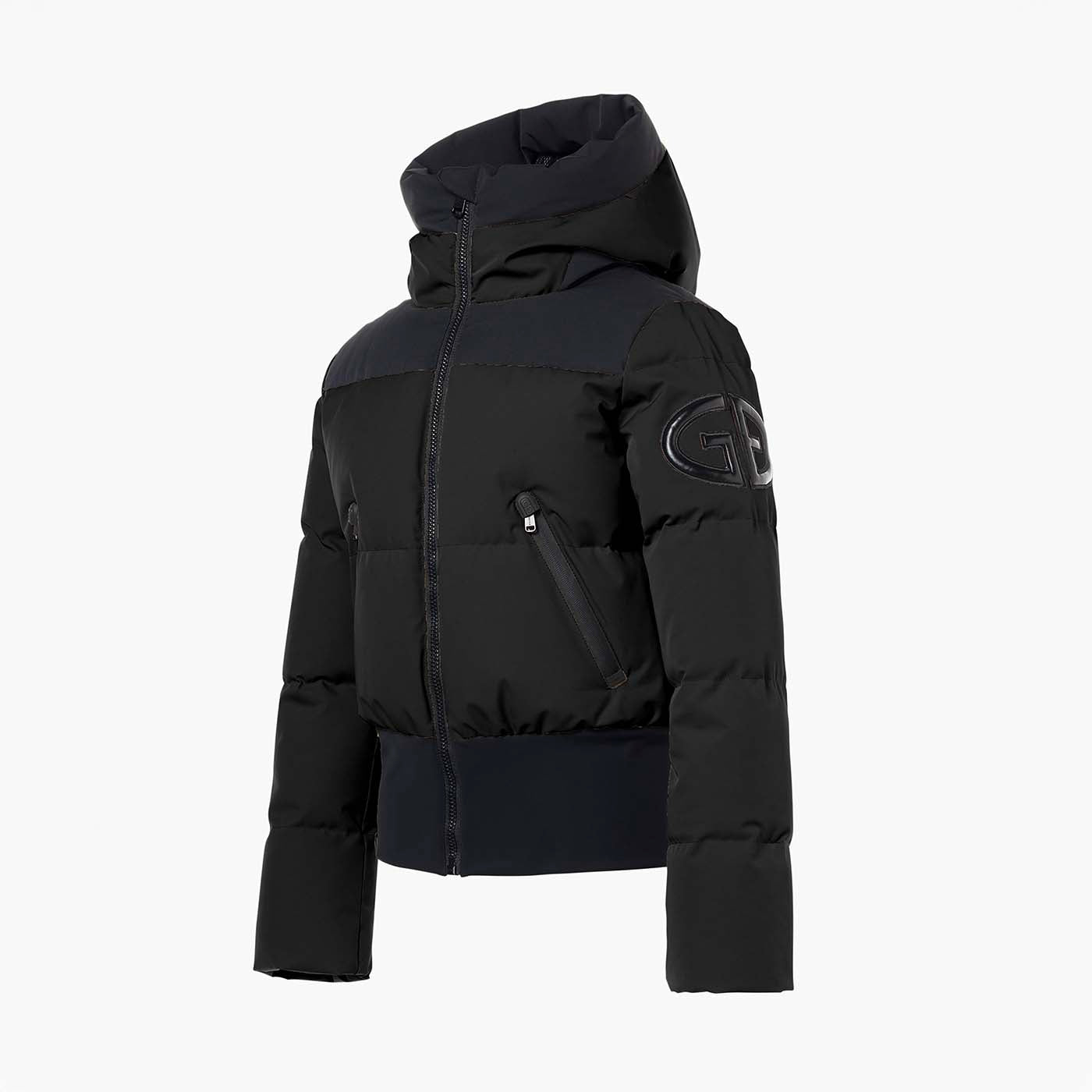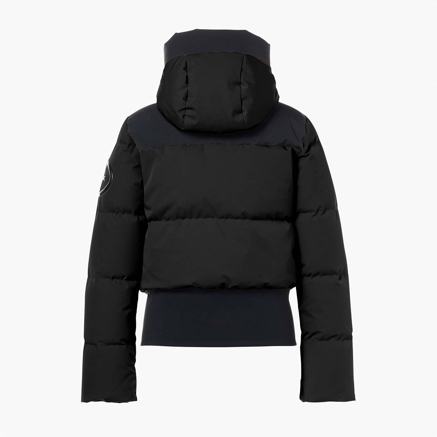 This quilted down bomber jacket with a hood combines warmth, comfort, and a sleek finish. Crafted from partly recycled outer shell fabric with a partly recycled lining featuring an anti-odor finish, it’s insulated with RDS-certified down for superior warmth. Designed for functionality, it includes two outer pockets, two inner pockets, and a sleeve pocket for a ski pass. A fixed hood and knitted inner cuffs provide added protection against the cold.