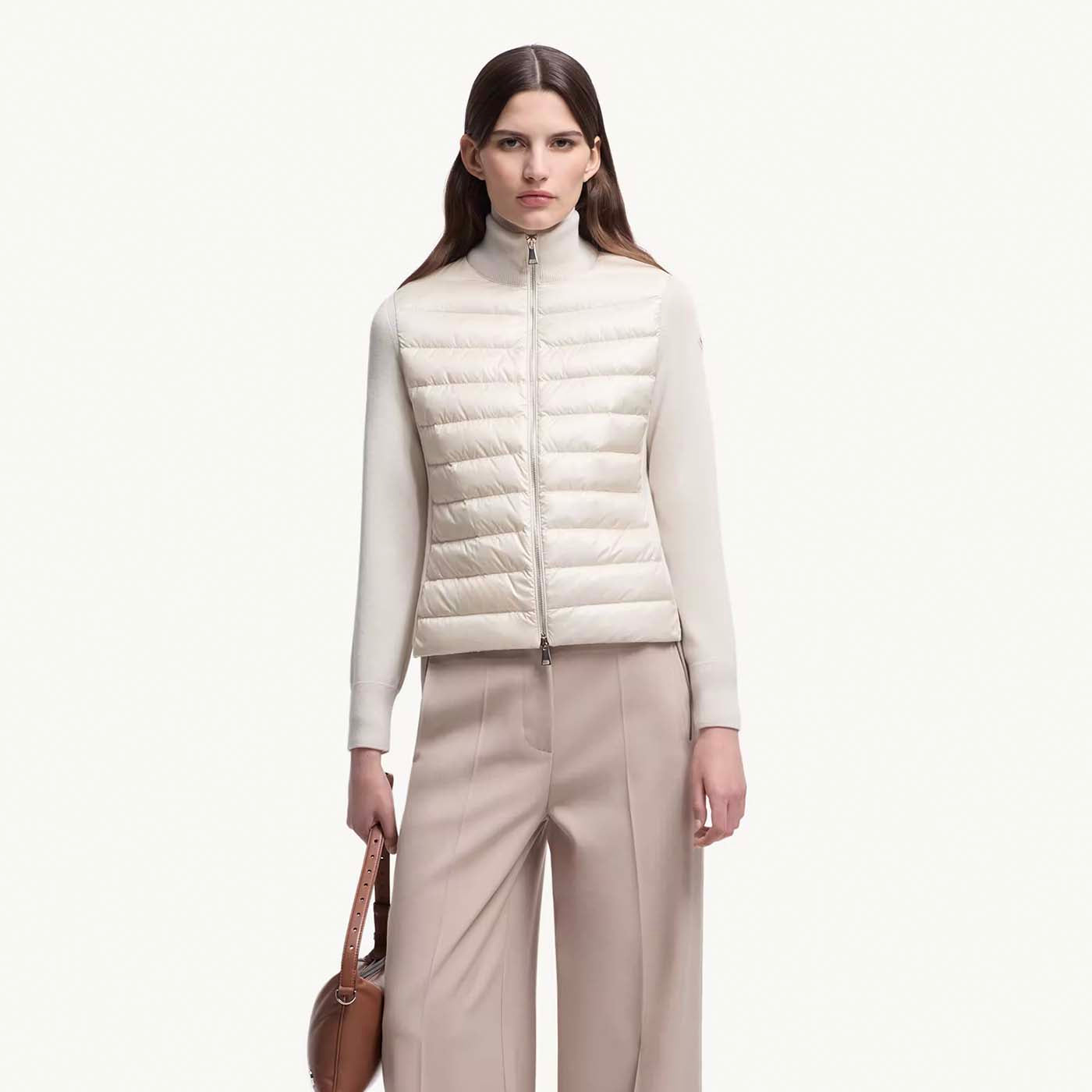 Easily doubling as outerwear when the weather allows, this women’s wool cardigan blends knitwear softness with the warmth of a down-filled longue saison front. Crafted from ultra-fine wool, the lightweight zip-up features a high neck for extra coziness and a sleek, minimal silhouette. A refined layering piece, it transitions effortlessly through shifting seasons and temperature changes.