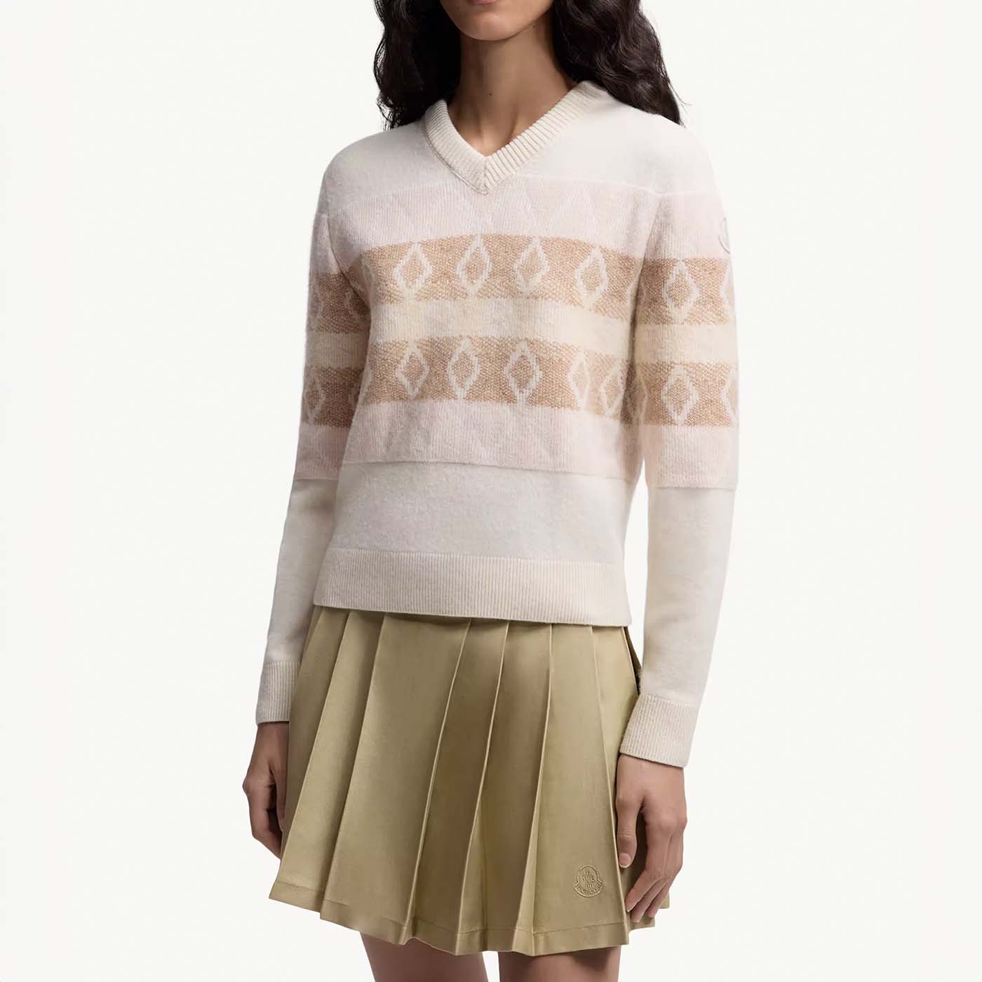 Offering lightweight warmth with a soft feel, this V-neck sweater is knit from wool. The timeless design is elevated with a jacquard pattern in gentle pastel shades.